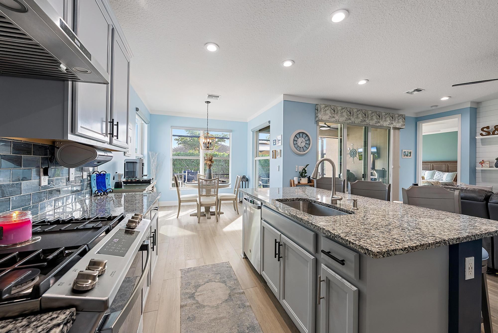 Live the Valencia Cay lifestyle at Riverland in Tradition, Port St. Lucie, a premier 55+ community. This upgraded 2-bedroom, 2-bath Egret model features include crown molding, luxury vinyl flooring, custom closet shelving, upgraded pantry pull-out shelves, laundry barn door, etched glass front door, frameless shower doors, & added lighting. Enjoy a widened driveway, garden curbing, patio lighting, & extended 20'x13' rear patio perfect for entertaining. Screened front / rear porches & fenced backyard create ideal indoor-outdoor living. Impact windows, security cameras, & exterior generator connection add peace of mind. Valencia Cay offers a resort-style clubhouse, pools, fitness center, pickleball, tennis, trails, clubs, & social events. Close to I-95, shopping, dining, & Cleveland Clinic.