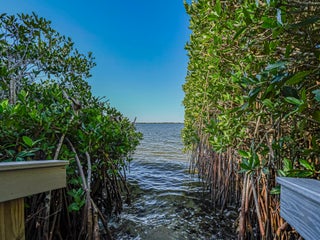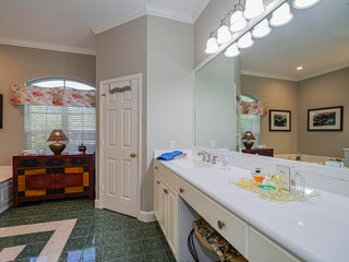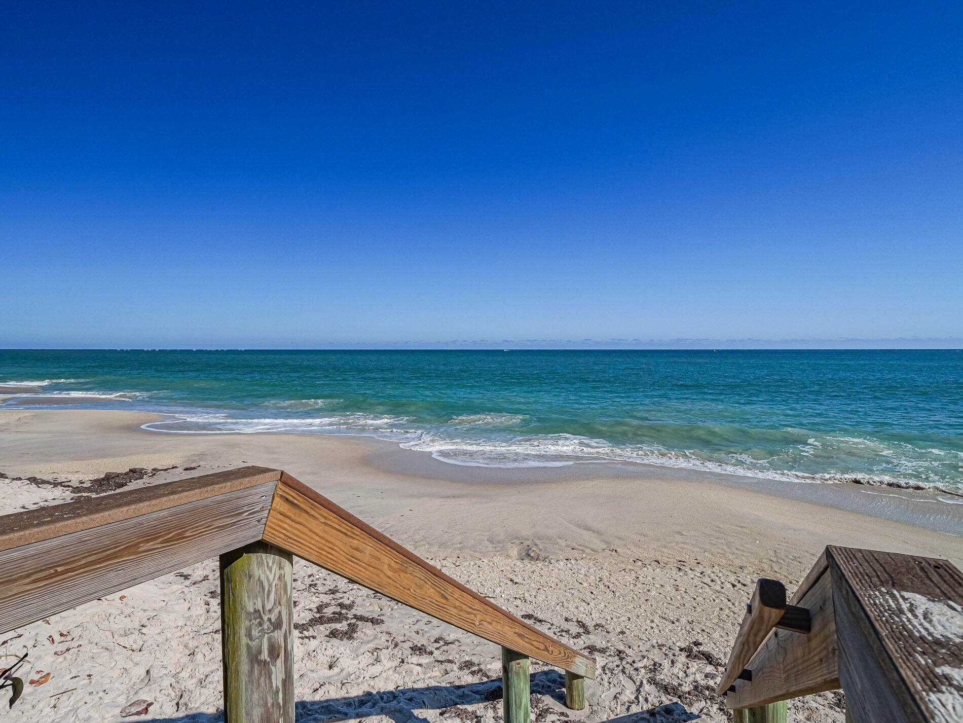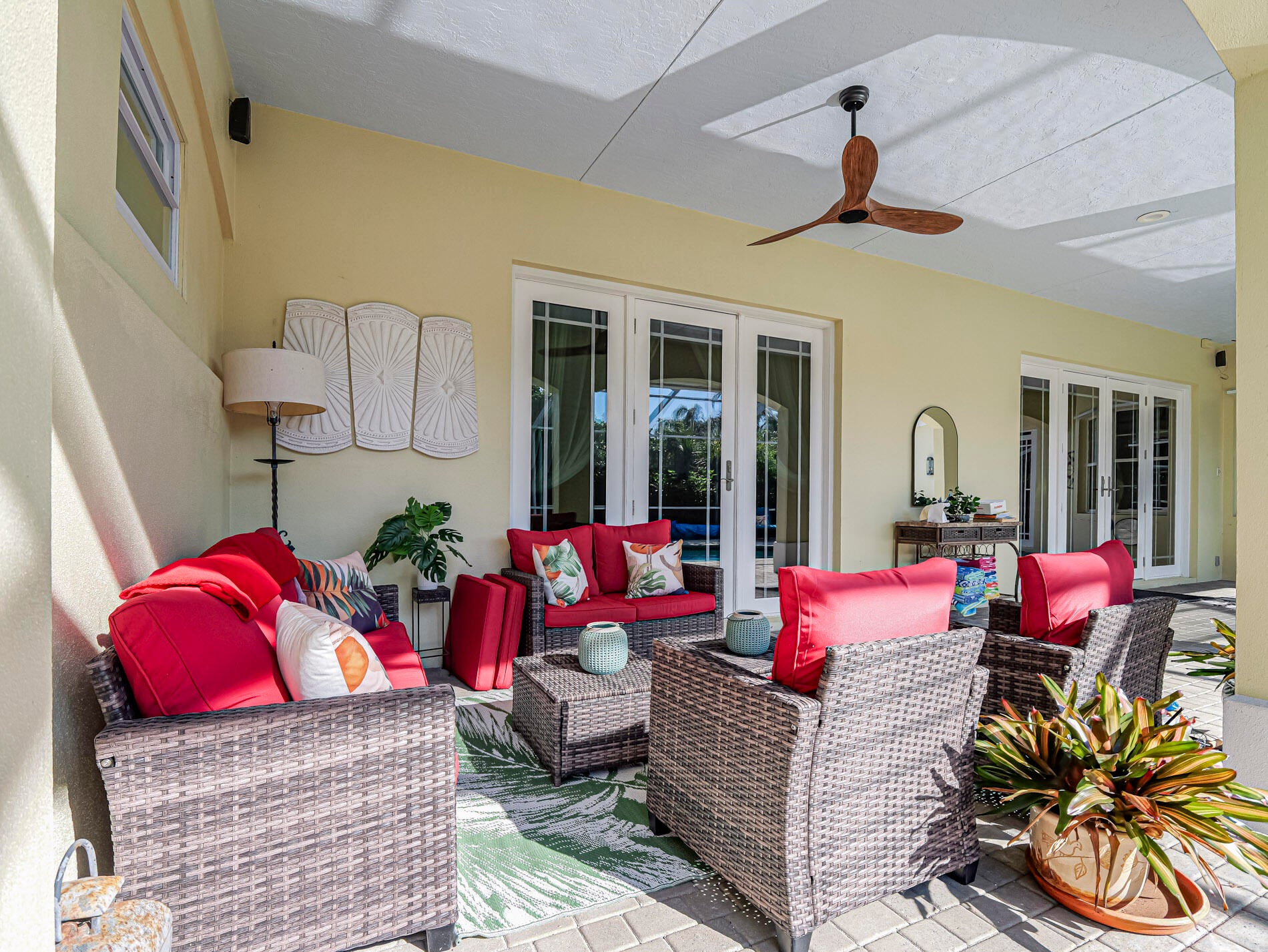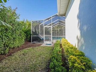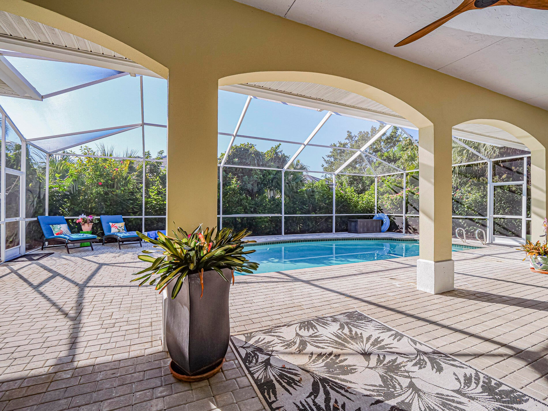 Stately 3000 sq ft. CBS home. A 3/3 in gated Sandpointe, with deeded beach access and river access! Welcome to this luxury residence with gracious double door entrance, foyer, private office, 10ft ceilings, crown moldings stone center island kitchen with breakfast nook & family room with wood burning fireplace. Large living room w/sliders to amazing lanai with heated salt water pool, and outdoor living area. A formal dining room is large enough to host dinner parties. Split BR plan - primary en suite with 2 large walk ins, full bath with soaker tub, separate shower and dual vanities. 2 other bedrooms have 2 other large full baths. 2 lovely side garden/BBQ areas. Separate laundry room w/ sink, upgraded appliances, impact windows, newer central air, paver driveway and pool patio