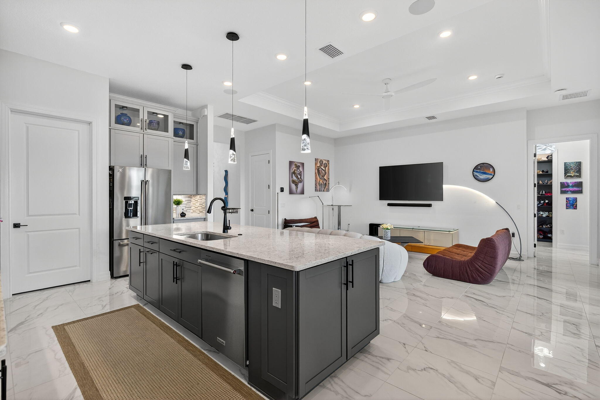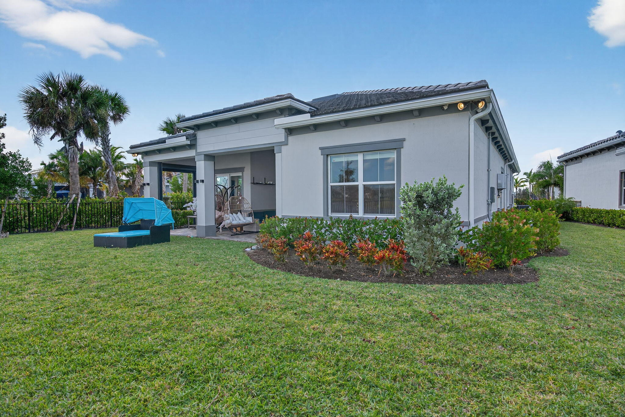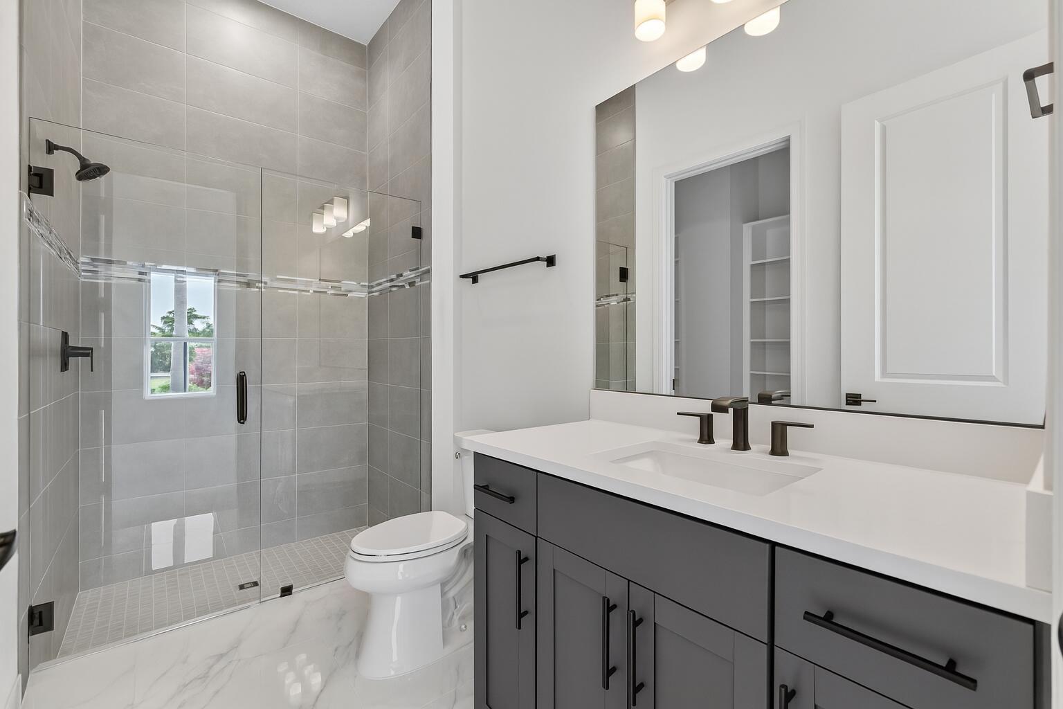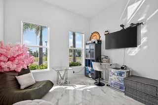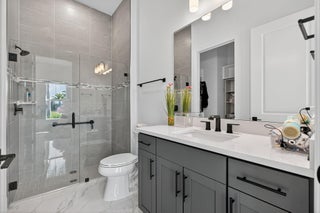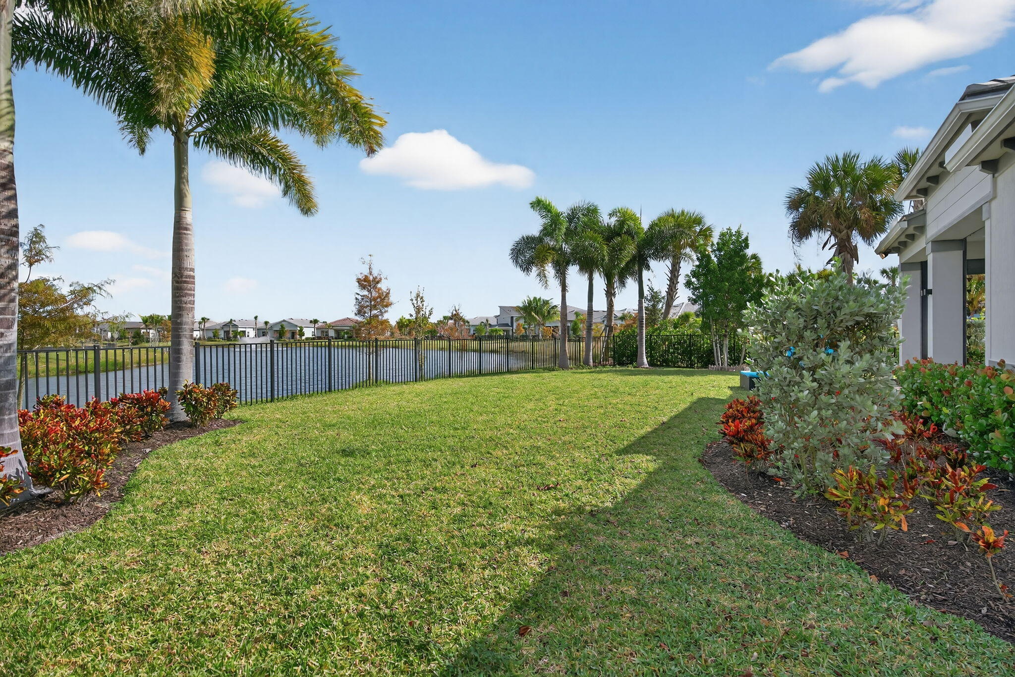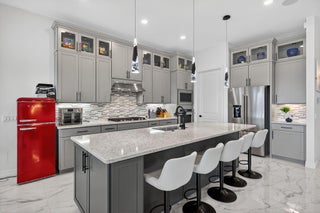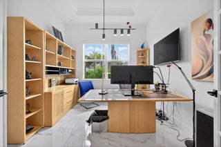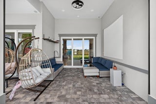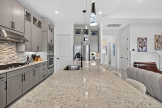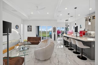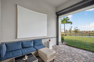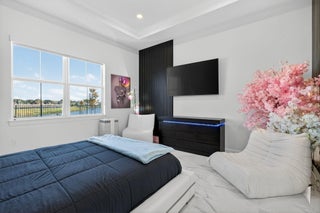 This beautifully upgraded Prestige Model in Avenir sits on a premium wide-water lakefront lot with no rear neighbors and offers more than $150,000 in high-end improvements. The home features modern marble-look porcelain tile throughout, designer lighting, and a fully integrated smart-home system with cameras, alarm monitoring, Sonos speakers, and professional structured wiring that provides hard-wired internet, TV, and audio connections in multiple rooms. The gourmet kitchen includes stacked 42'' cabinets, soft-close drawers, roll-out trays, extended island panels, matte black hardware, and upgraded quartz countertops. The great room opens to peaceful lake views through oversized sliders, creating a bright and open living space. The primary suite features a custom slat accentwall and a spa-style bathroom with upgraded cabinetry, fixtures, and quartz counters. Additional upgrades include Closets by Design custom storage, a full LeafFilter gutter system with lifetime warranty, professional landscape lighting, and a brand-new Generac whole-house generator for full power protection during storms. The home also features motorized storm protection screens, offering fast, effortless hurricane security and added shade when needed. A home systems warranty is included, providing added protection for electronics and appliances. Residents of Avenir enjoy award-winning amenities such as a resort-style clubhouse, beach-entry pool, lap lanes, spa, fitness center, tennis, pickleball, splash park, playground, and miles of walking trails. This home is better than new, move-in ready, and loaded with upgrades inside and out.
