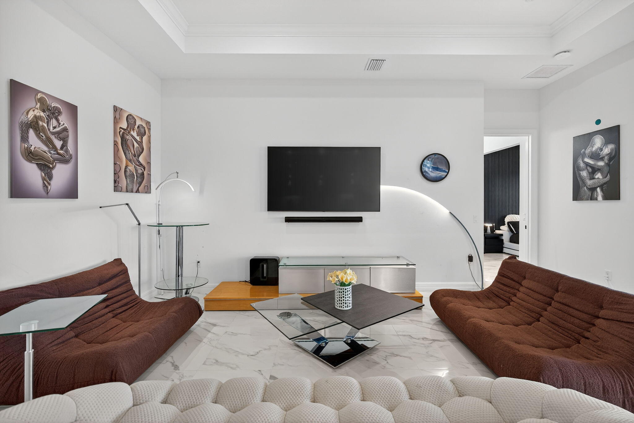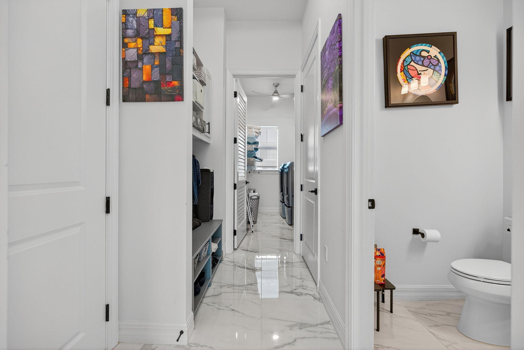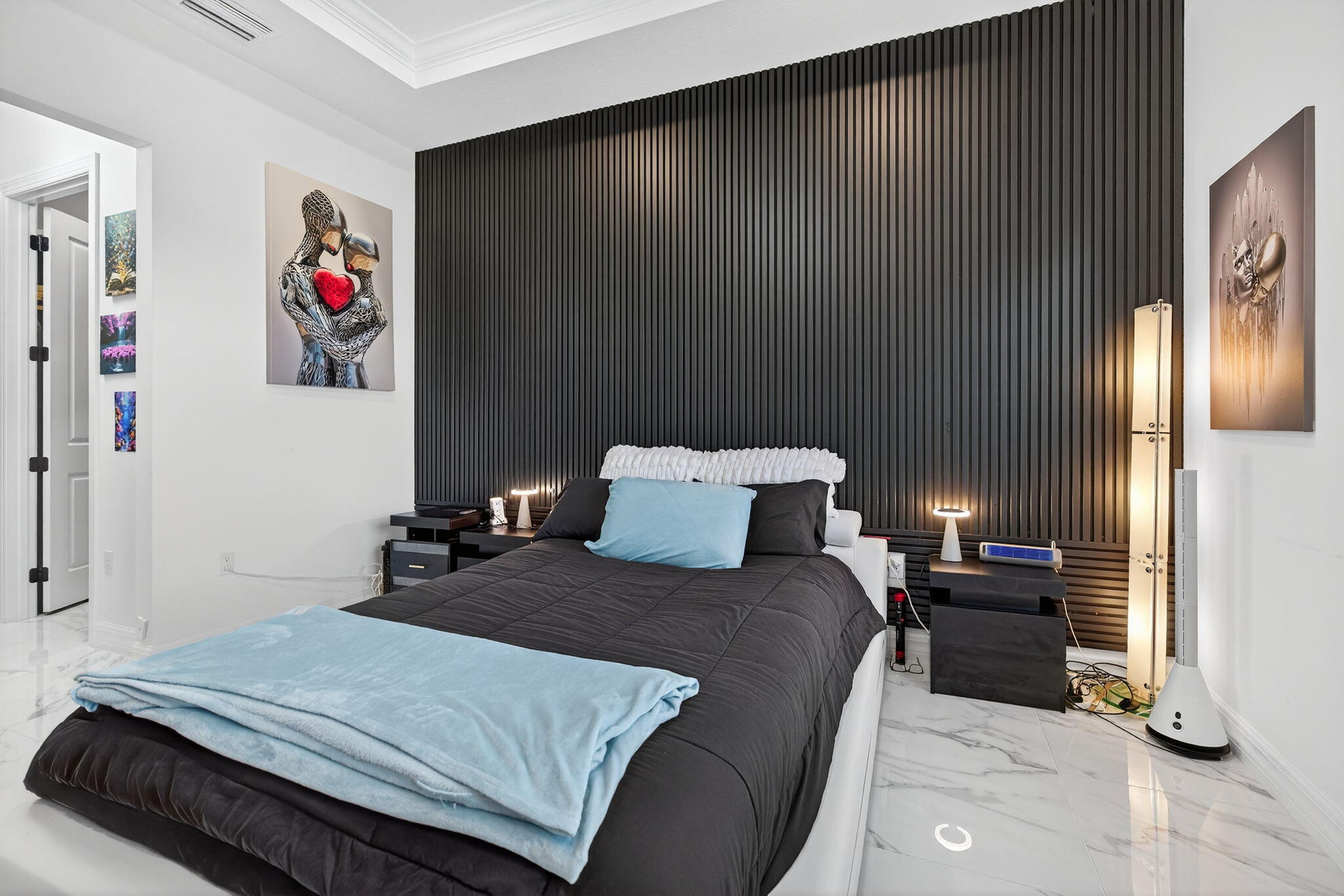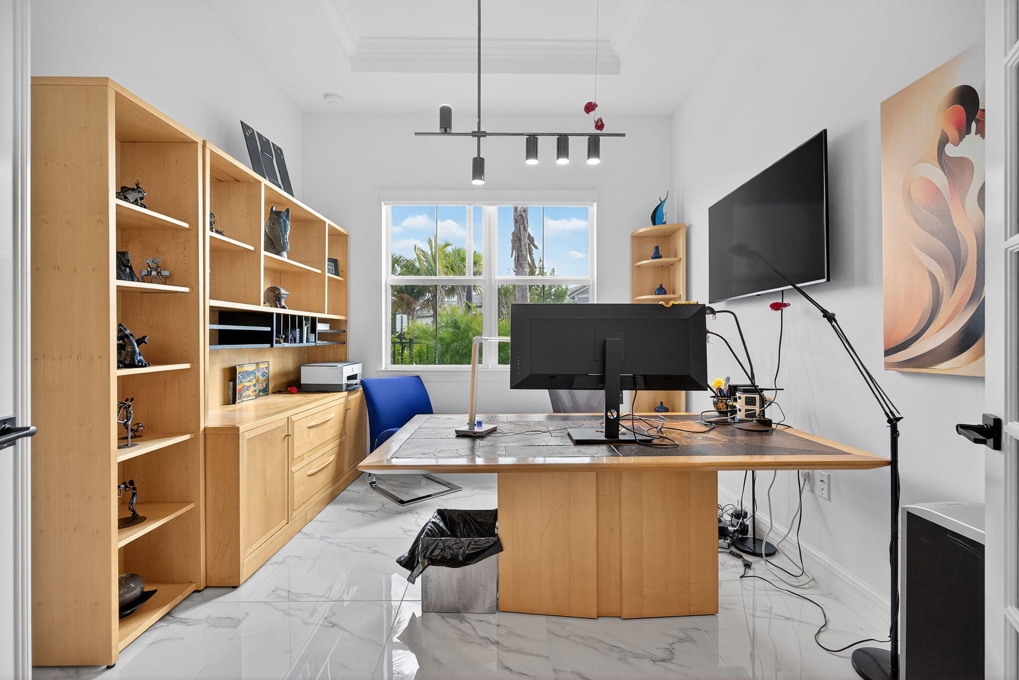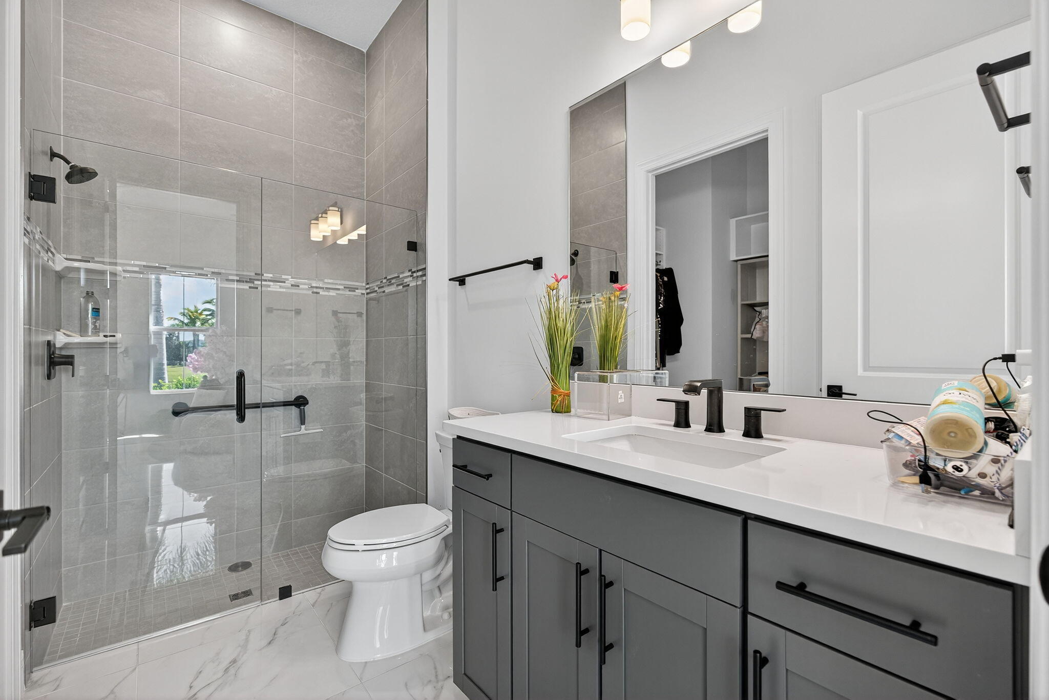 This beautifully upgraded Prestige Model in Avenir sits on a premium wide-water lakefront lot with no rear neighbors and offers more than $150,000 in high-end improvements. The home features modern marble-look porcelain tile throughout, designer lighting, and a fully integrated smart-home system with cameras, alarm monitoring, Sonos speakers, and professional structured wiring that provides hard-wired internet, TV, and audio connections in multiple rooms. The gourmet kitchen includes stacked 42'' cabinets, soft-close drawers, roll-out trays, extended island panels, matte black hardware, and upgraded quartz countertops. The great room opens to peaceful lake views through oversized sliders, creating a bright and open living space. The primary suite features a custom slat accentwall and a spa-style bathroom with upgraded cabinetry, fixtures, and quartz counters. Additional upgrades include Closets by Design custom storage, a full LeafFilter gutter system with lifetime warranty, professional landscape lighting, and a brand-new Generac whole-house generator for full power protection during storms. The home also features motorized storm protection screens, offering fast, effortless hurricane security and added shade when needed. A home systems warranty is included, providing added protection for electronics and appliances. Residents of Avenir enjoy award-winning amenities such as a resort-style clubhouse, beach-entry pool, lap lanes, spa, fitness center, tennis, pickleball, splash park, playground, and miles of walking trails. This home is better than new, move-in ready, and loaded with upgrades inside and out.