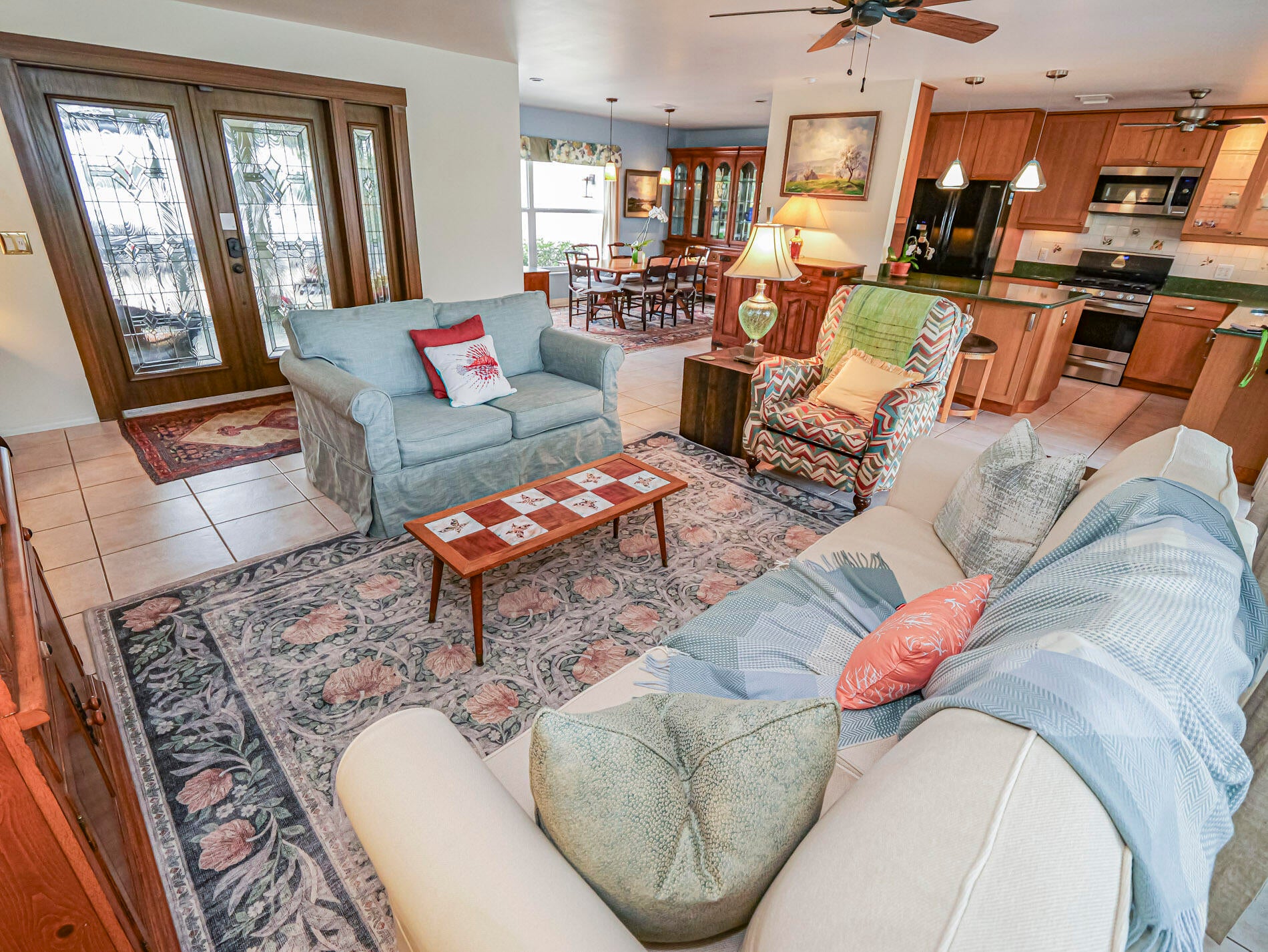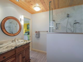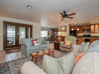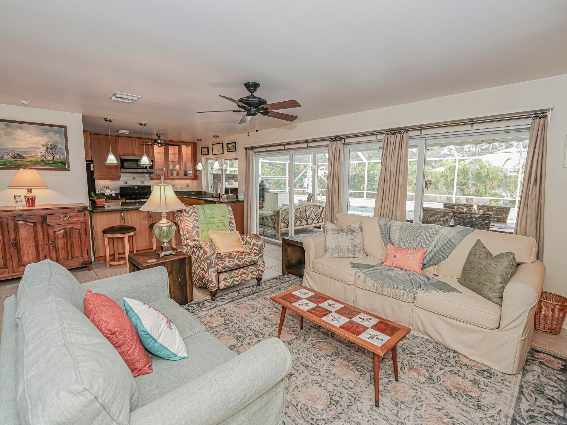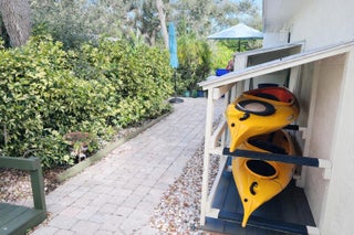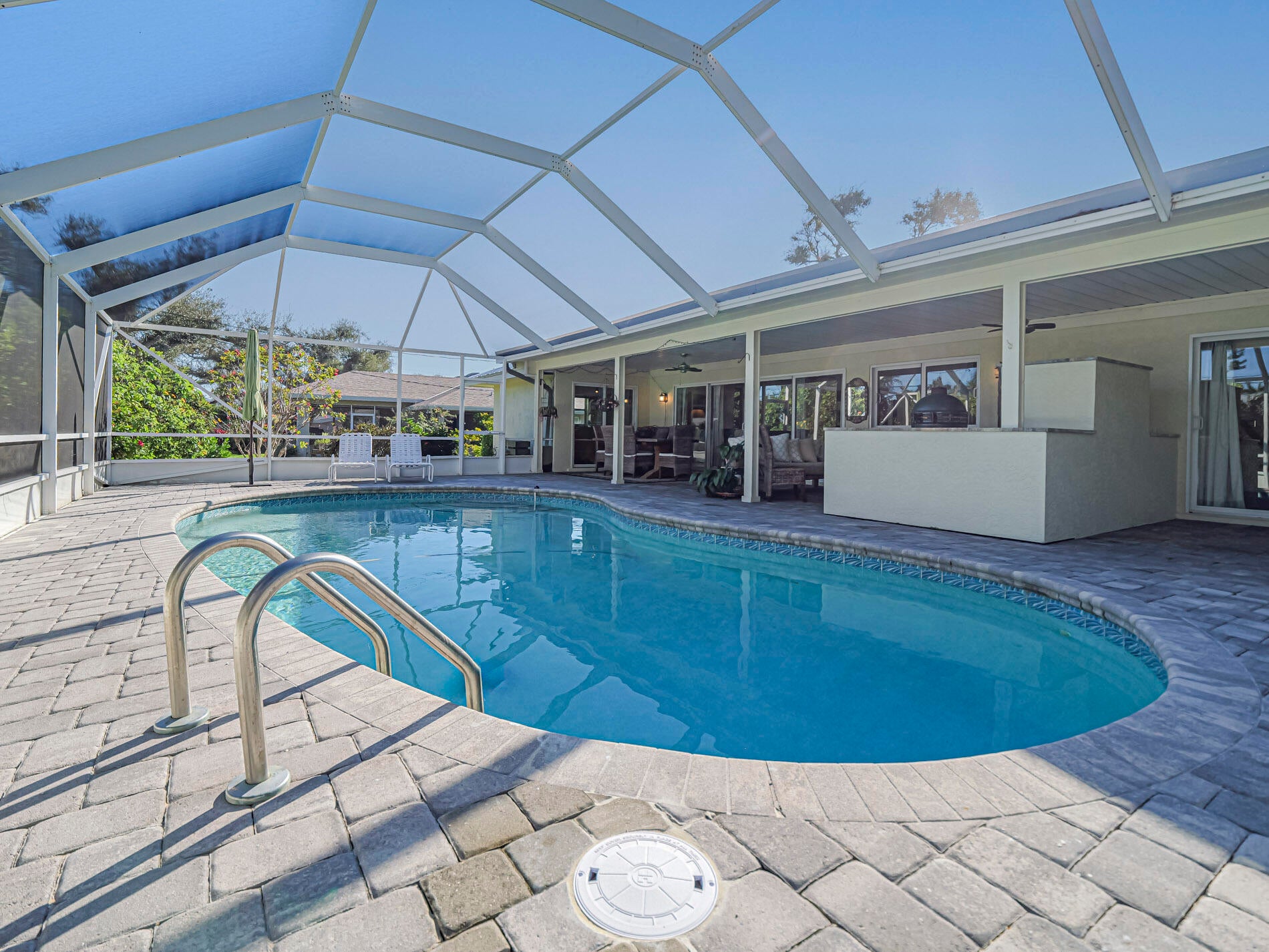 Central Beach Beauty, w/saltwater pool. NO HOA -- only 2 owners have owned this CBS masterpiece. Impact windows & 2025 metal roof & newer, 5 year old central air in this completely remodeled classic. Located on a quiet, tree lined street, short walk to beach, and near to shops and stores. Set on 90X132 lot. All tile, split BR plan, Solid white oak cabinetry and stone counters with upgraded light fixtures in the kitchen, formal dining area, large living area, and bonus --enclosed porch with slated wood ceiling looks out front with gardeners oasis of botanical delights. Side garden and shed with kayak storage, outdoor shower. Best of all --a gas stone hearth fireplace takes center stage in 44X35 lanai with outside dining and living area! 2 newer custom baths