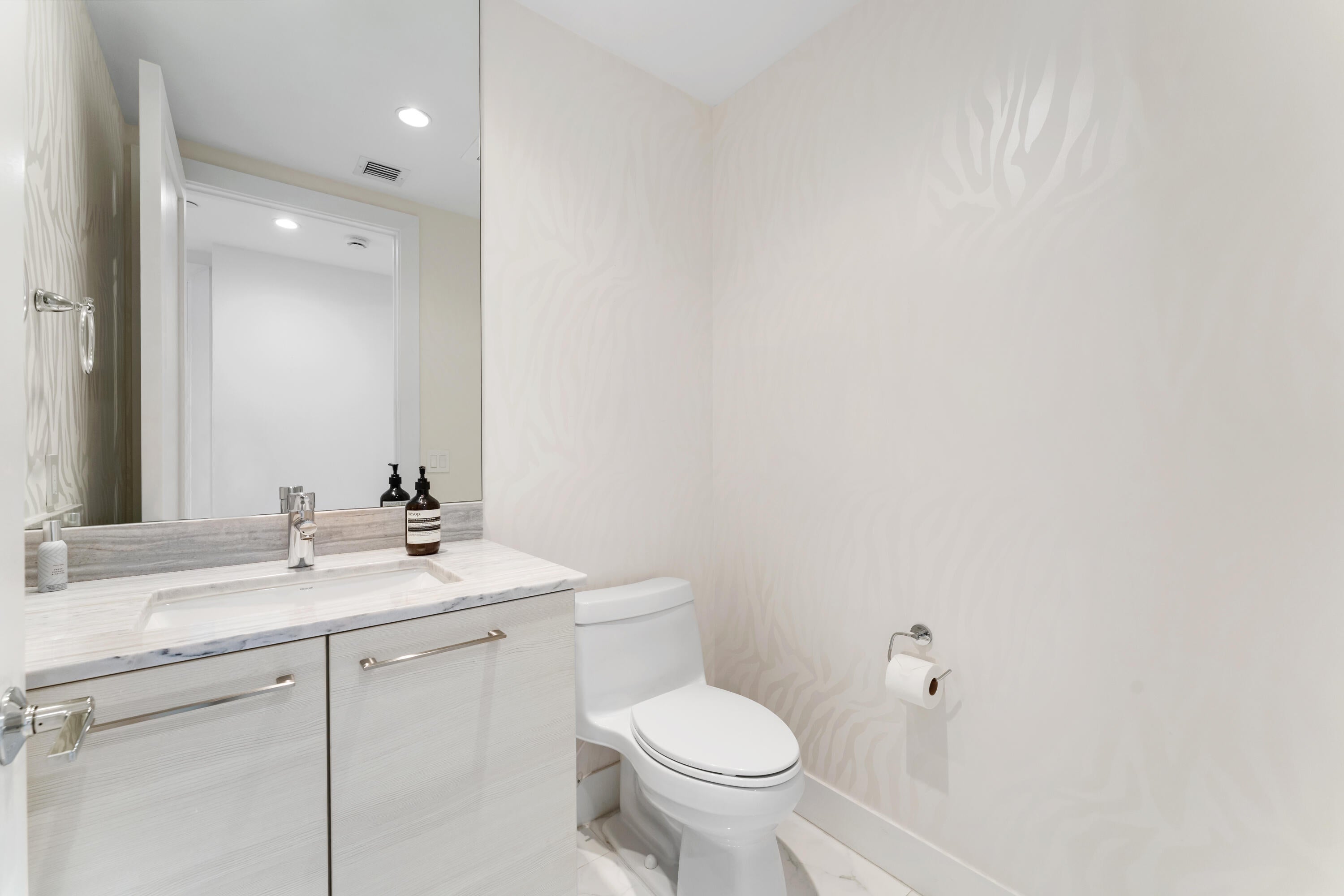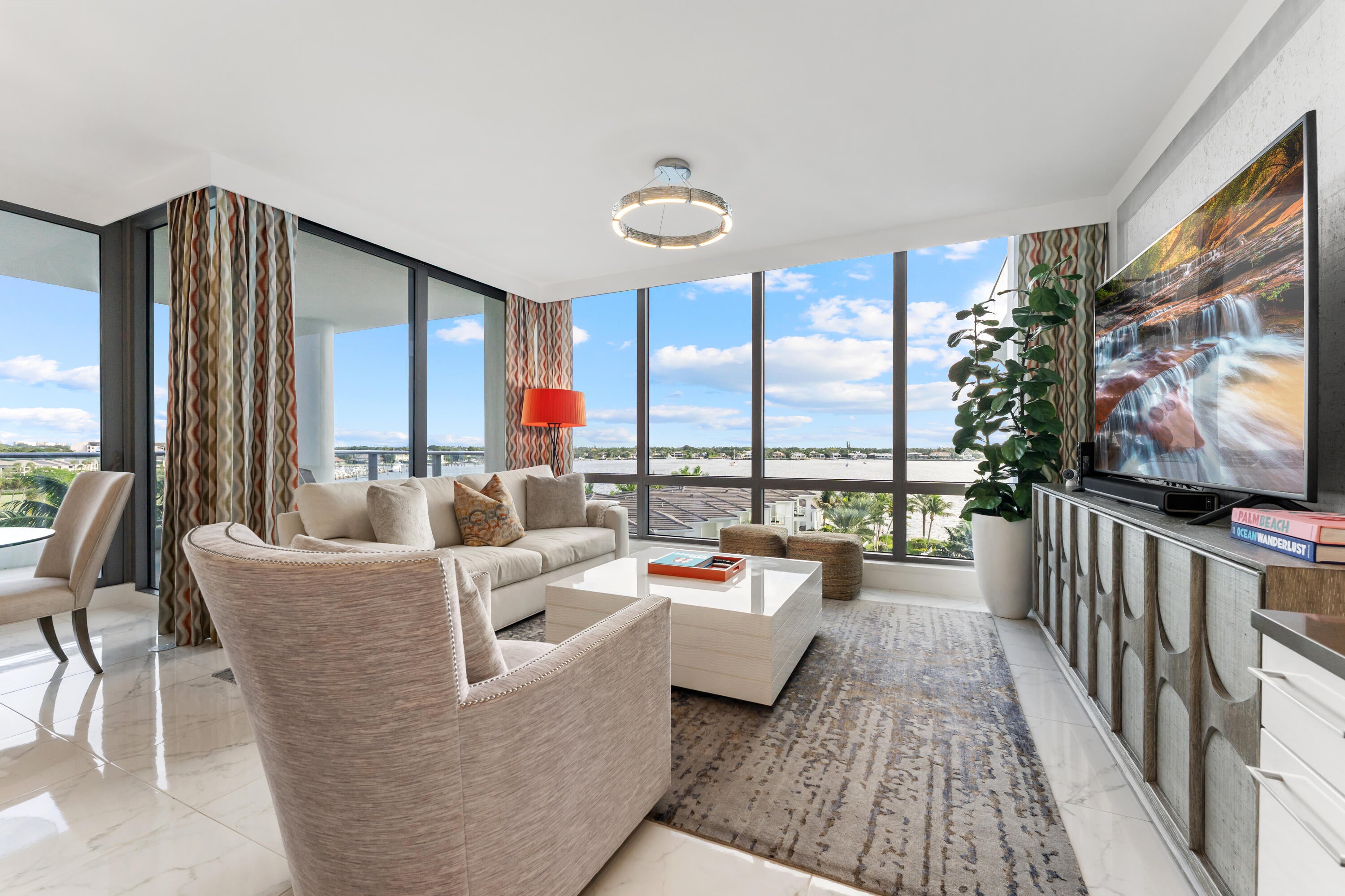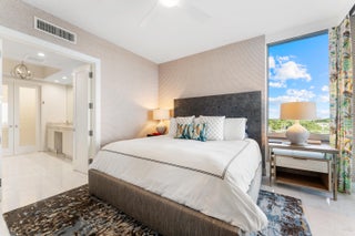 FULLY FURNISHED designer residence at Water Club with breathtaking panoramic water views. Floor-to-ceiling glass fills the home with natural light, while a private elevator entry provides comfort and privacy. Offering 2 bedrooms, 2.5 baths and a designated office/den, this is an ideal turnkey, lock-and-leave residence. Two private balconies - one east for water and sunrise views, one west for sunset skies. One of Palm Beach County's most prestigious waterfront communities, amenities include 24/7 concierge and manned gate, private marina with resident day dock, three pools, two hot tubs, two fitness centers, locker rooms with steam and sauna, beach cabanas, club room, pickleball court, dog park, and resident hotel suites. Pet friendly - up to three pets and no size restrictions.Located minutes from the area's best restaurants, GOLF and shopping. Easy access to I-95 and FL Trnpk, PBI Airport, Palm Beach, West Palm and Jupiter. TRULY SPECTACULAR VIEWS!