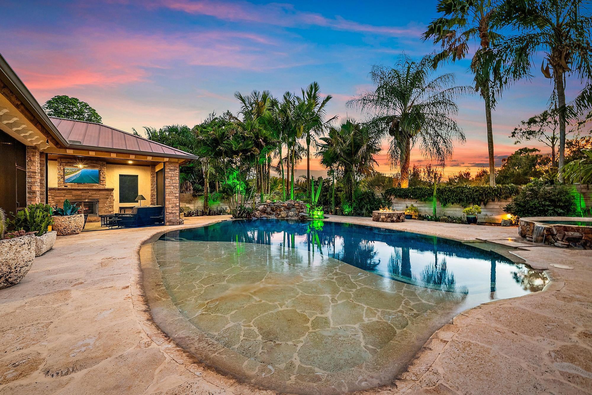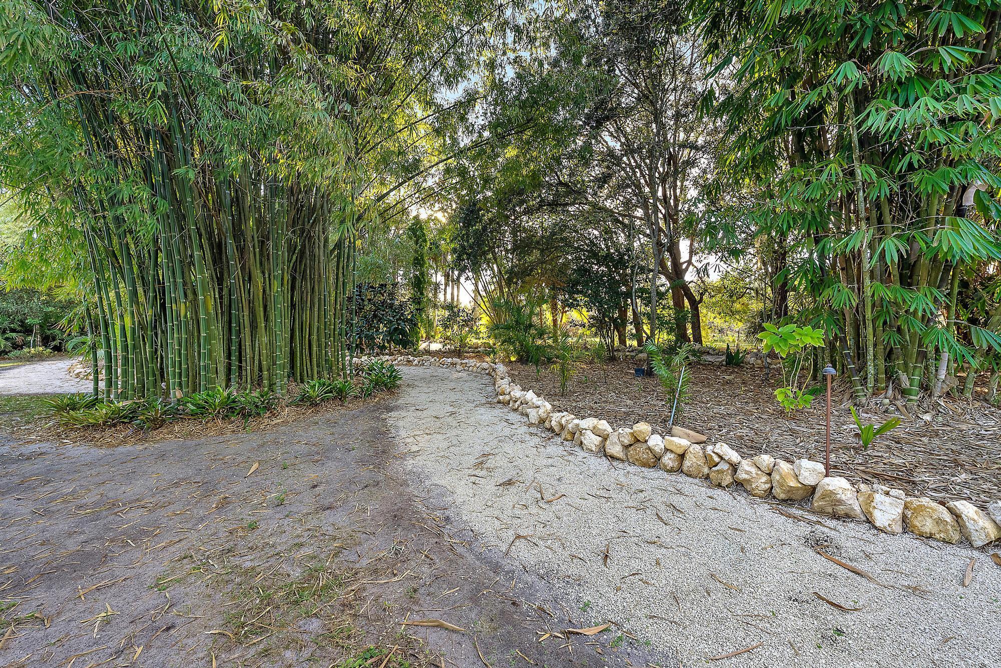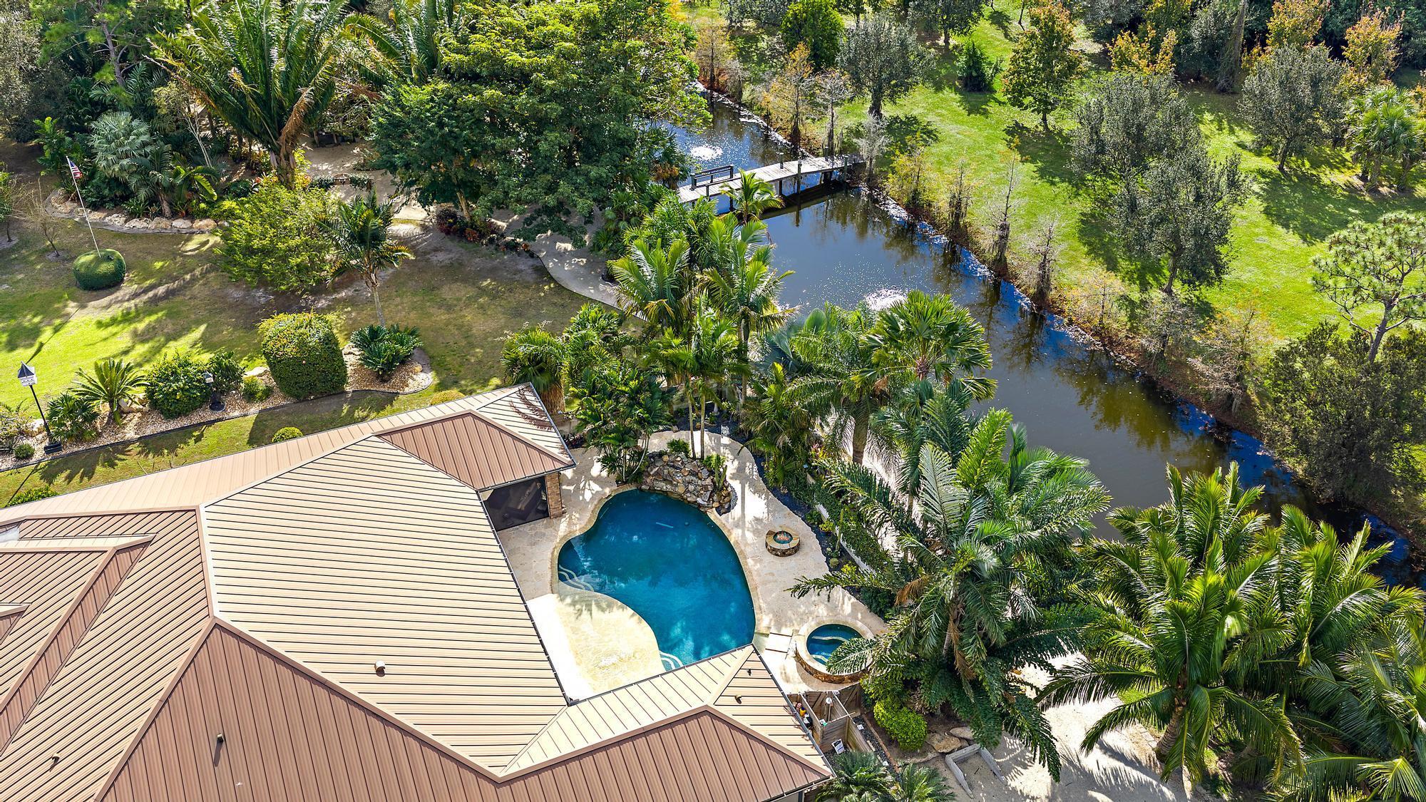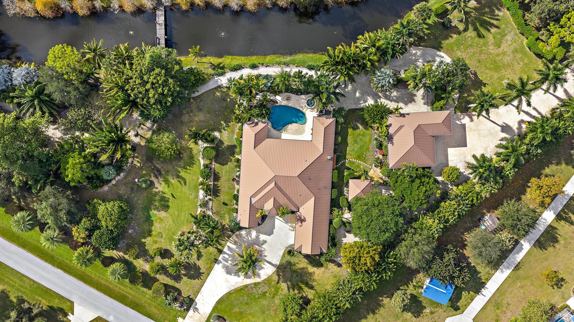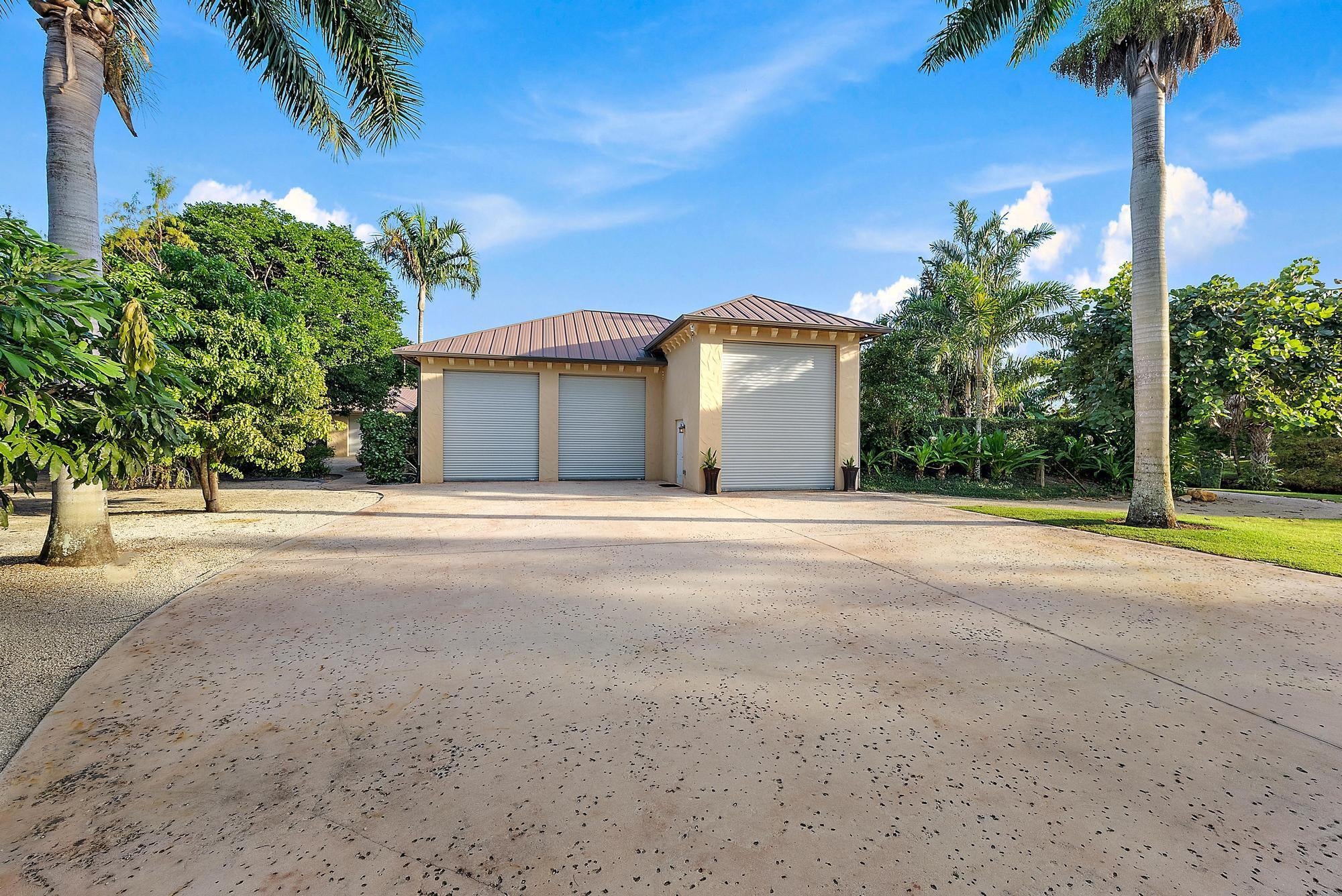 Welcome to ''Elephant Walk'', a private Palm City estate of rare distinction, on 5.8 pristine acres in the exclusive Stuart West equestrian community of Martin County. Designed in 2012 with CBS construction, this Southwestern-inspired residence blends architectural character with refined Florida luxury. Offering 3,667 sq ft under air and 6,277 sq ft total, the estate includes a 3BR, 3.5 BA Main Home plus a private 1BR/1BA Guest Cottage ideal for guests or extended stays. Rich African mahogany flooring, travertine tile, soaring 10-14 foot ceilings, impact glass, crown moldings, and Electrolux Icon appliances showcase exceptional craftsmanship throughout. Car collectors will appreciate the 6-8 car garages: attached 3-car garage plus air conditioned 1,710-sq-ft detached 5-car garage/workshop.Detached garage has room for interior RV/Boat Parking. The owner's suite is a tranquil retreat featuring dual walk-in closets and a spa-style bath with jacuzzi tub and whole-body spray shower. A dedicated office, wine and coffee bar, and expansive great room enhance the interiors. Designed for entertaining, the 1,200-square-foot screened lanai features a custom horseshoe bar, gas fireplace, surround sound, and space for gatherings of 25 or more. Outdoors, enjoy a resort-style freeform pool with raised spa, firepit, and summer kitchen. The grounds unfold as a botanical sanctuary with winding stone paths, specialty palms, and a 3/4-acre lake. The Cape Club Golf Membership is available separately. Minutes from I-95, Turnpike, quaint downtown Stuart, golf, boating, dining, and beaches, Elephant Walk is more than a residence, it is a lifestyle retreat. Call Today for Your Private Showing!