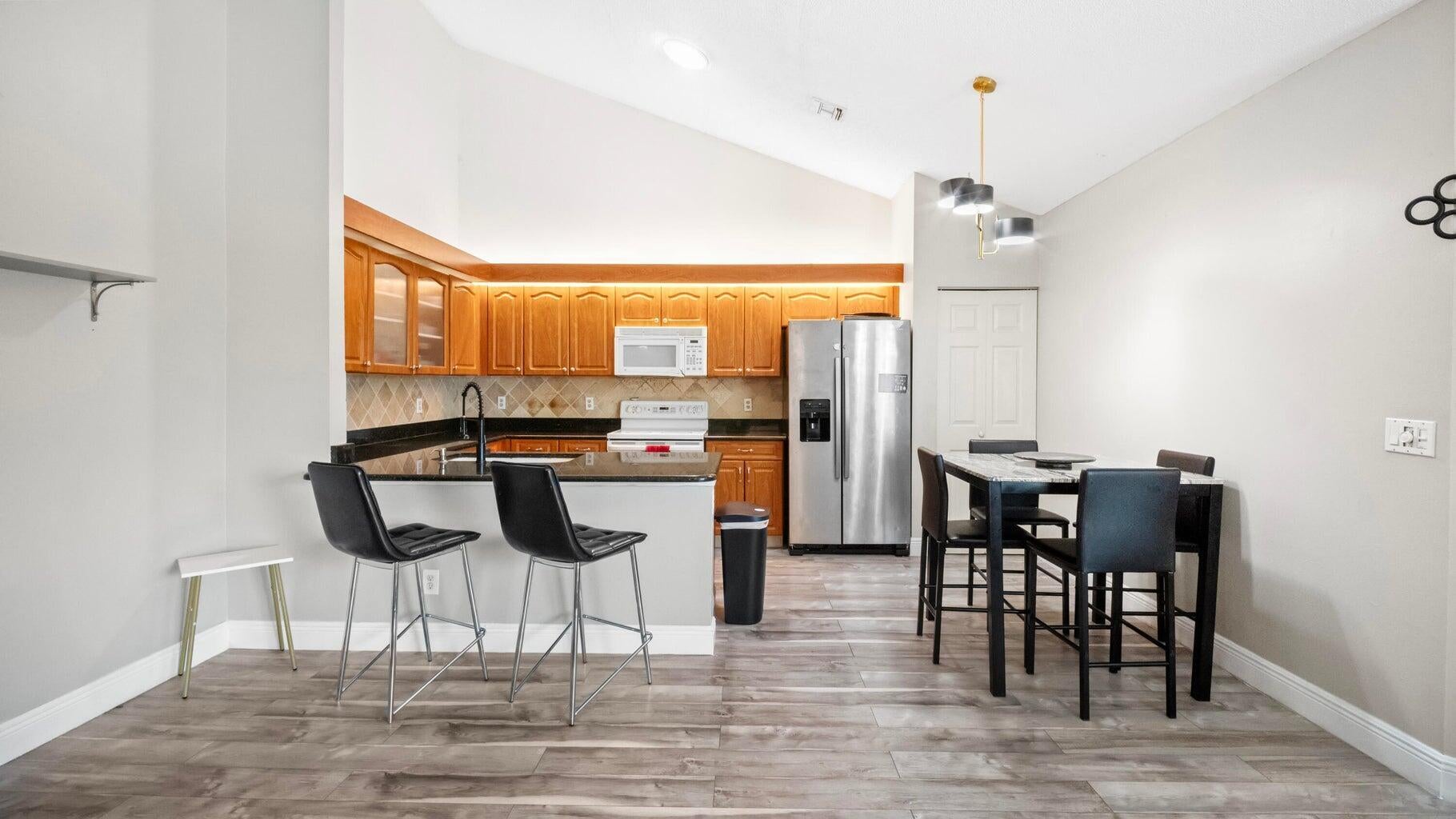 Discover this rare 3 bed, 2 bath townhouse in the charming Timberlane community of Greenacres, offering beautiful sweeping water views. Enjoy a bright open floor plan with cathedral ceilings, ceramic tile floors, and abundant natural light. The kitchen features granite counters, updated appliances, and ample storage. The primary suite offers high ceilings, dual closets, and a private bath. Two spacious bedrooms sit on the opposite side with a cabana bath and in-unit laundry. Every room opens to the private fenced-in patio with a huge screened space perfect for entertaining. LOW HOA, pet friendly, and close to shops, restaurants, the Turnpike, and golf courses.