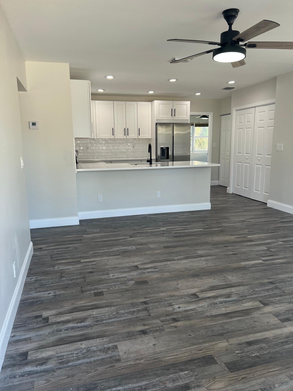 Three bedroom, two bath home featuring a modern kitchen with white shaker cabinets, quartz countertops, stainless steel appliances, and a pantry. Luxury vinyl plank flooring throughout complements the split floor plan, offering a spacious primary bedroom with a walk in closet and a large, updated en suite bath. Both bathrooms have been fully remodeled with quartz countertops. Enjoy a generous backyard ideal for entertaining, complete with easement access, plus a single car driveway with carport. Recent upgrades include impact windows (2022), a tankless water heater, central A/C with a mini split system, and updated plumbing and electrical with a newer breaker panel. Move in ready and conveniently located near downtown Lake Worth Beach, shopping, restaurants, and entertainment.