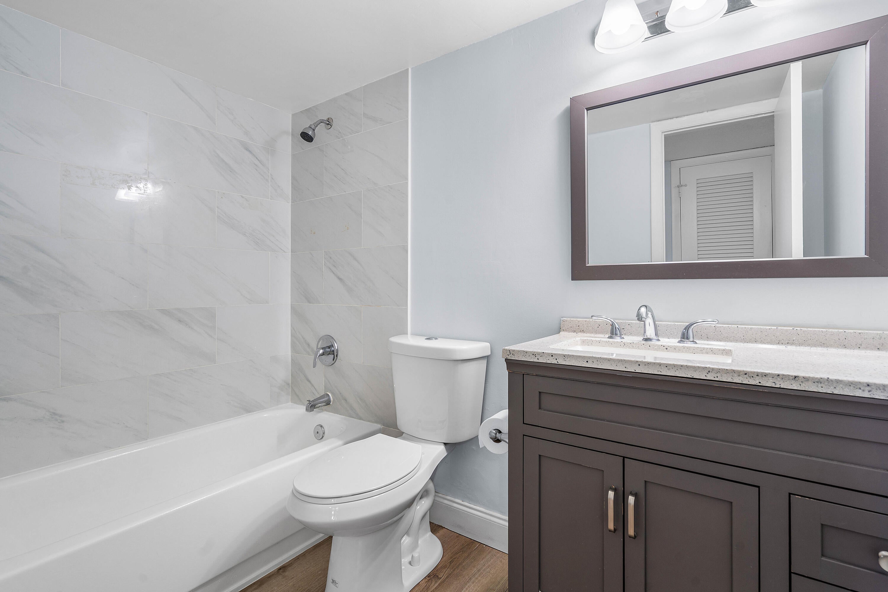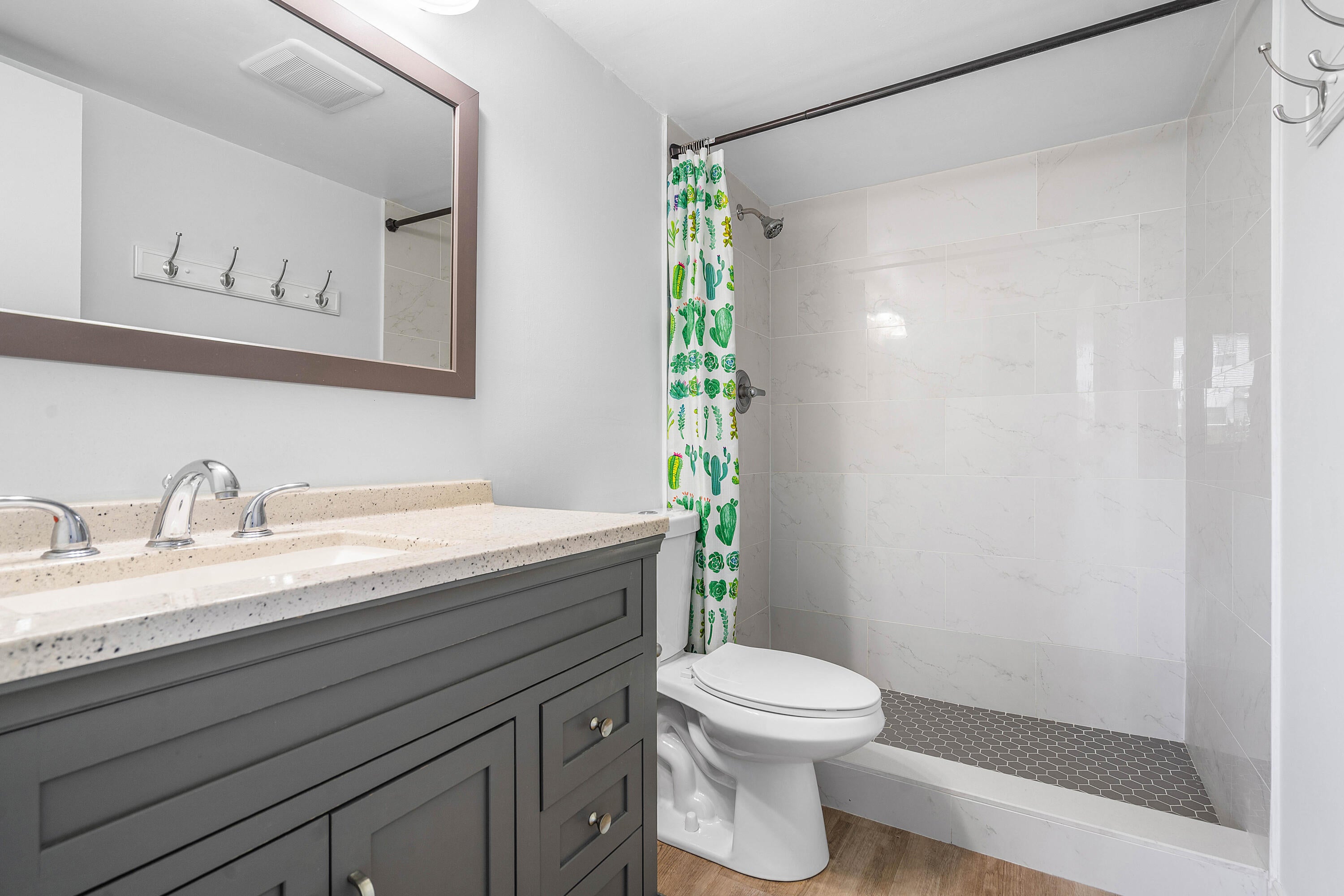 ALL-AGE COMMUNITY! This fully remodeled & upgraded 1ST floor condo is located in the desirable gated community of The Fountains in Lake Worth. Featuring 2 BR's and 2 BA's, the home offers a stylish split-bedroom layout with tile flooring throughout. The modern kitchen includes quartz countertops, stainless steel appliances, and a convenient breakfast bar. Both bathrooms have been beautifully updated--one with a handicap-accessible shower. Custom-built closets provide ample storage, and a full-size washer and dryer are included for added convenience. Enjoy tranquil garden views and access to resort-style amenities such as a clubhouse, pool, fitness center, tennis courts, and 24-hour manned security. With no mandatory membership fees and a prime location near top-rated schools, shopping,dining and major highways. DON'T LET YOUR BUYER MISS OUT ON THIS GREAT OPPORTUNITY!