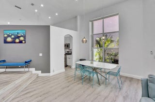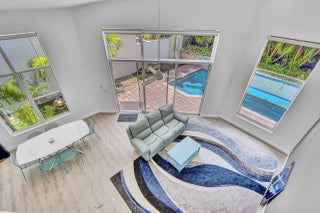 GREAT VALUE! This light & open 2-story home of 3 bedrooms & 2 1/2 baths features volume ceilings with LED lighting & custom ceiling fans; neutral luxury vinyl flooring & plantation shutters. The kitchen offers 42'' white cabinetry, white quartz countertops & stainless steel appliances. The Family Room has a contemporary built-in entertainment credenza. The Primary suite offers a spacious walk-in custom-configured closet. Other interior features include a built-in loft desk area; marble countertop in the upstairs secondary bathroom; newer washer & dryer, garage storage cabinets & tankless water heater. Relax in the inviting rear patio featuring a large pool with a waterfall, a turfed area & extensive tropical landscape design. Furnishings & golf cart available for sale.