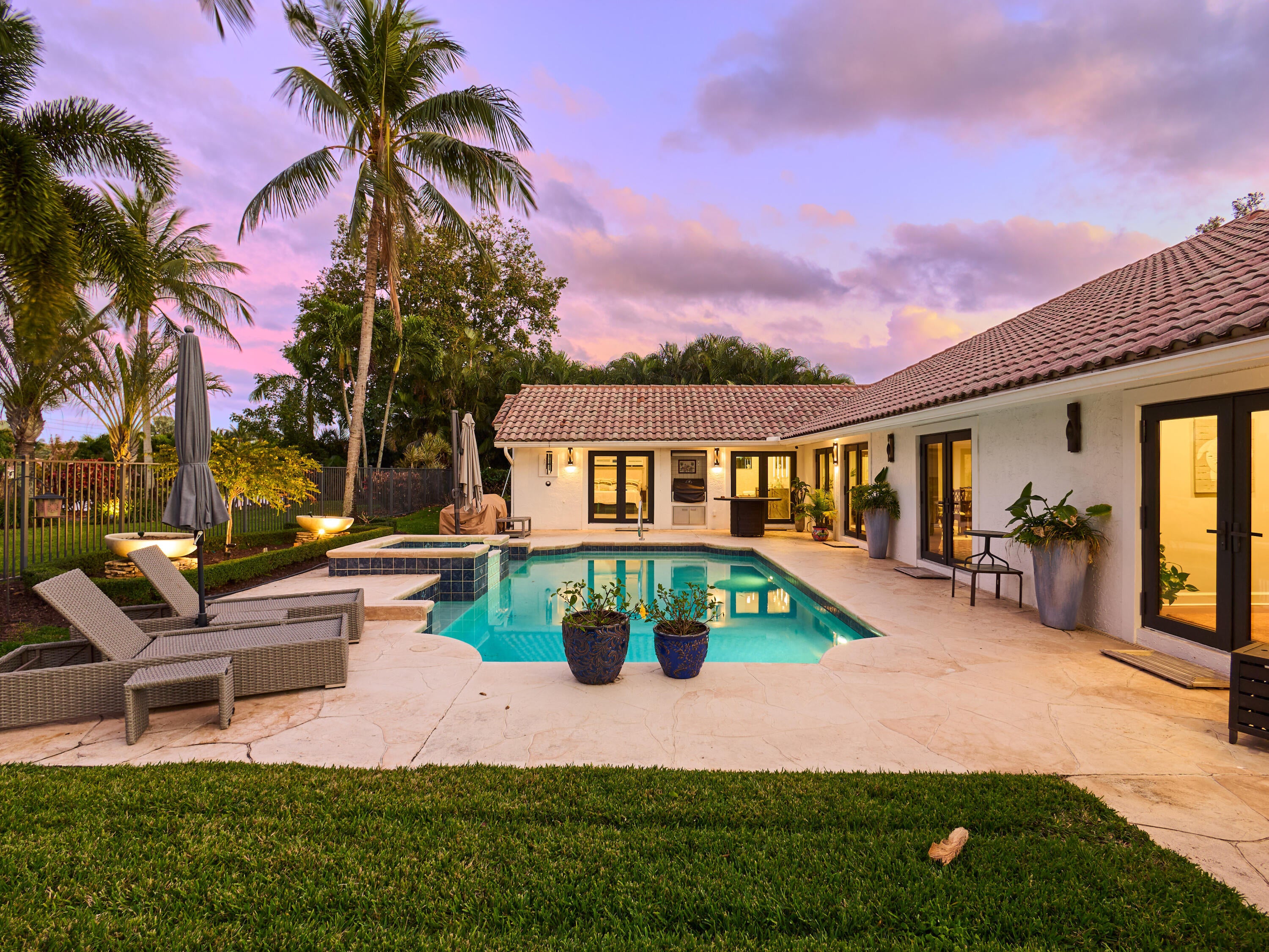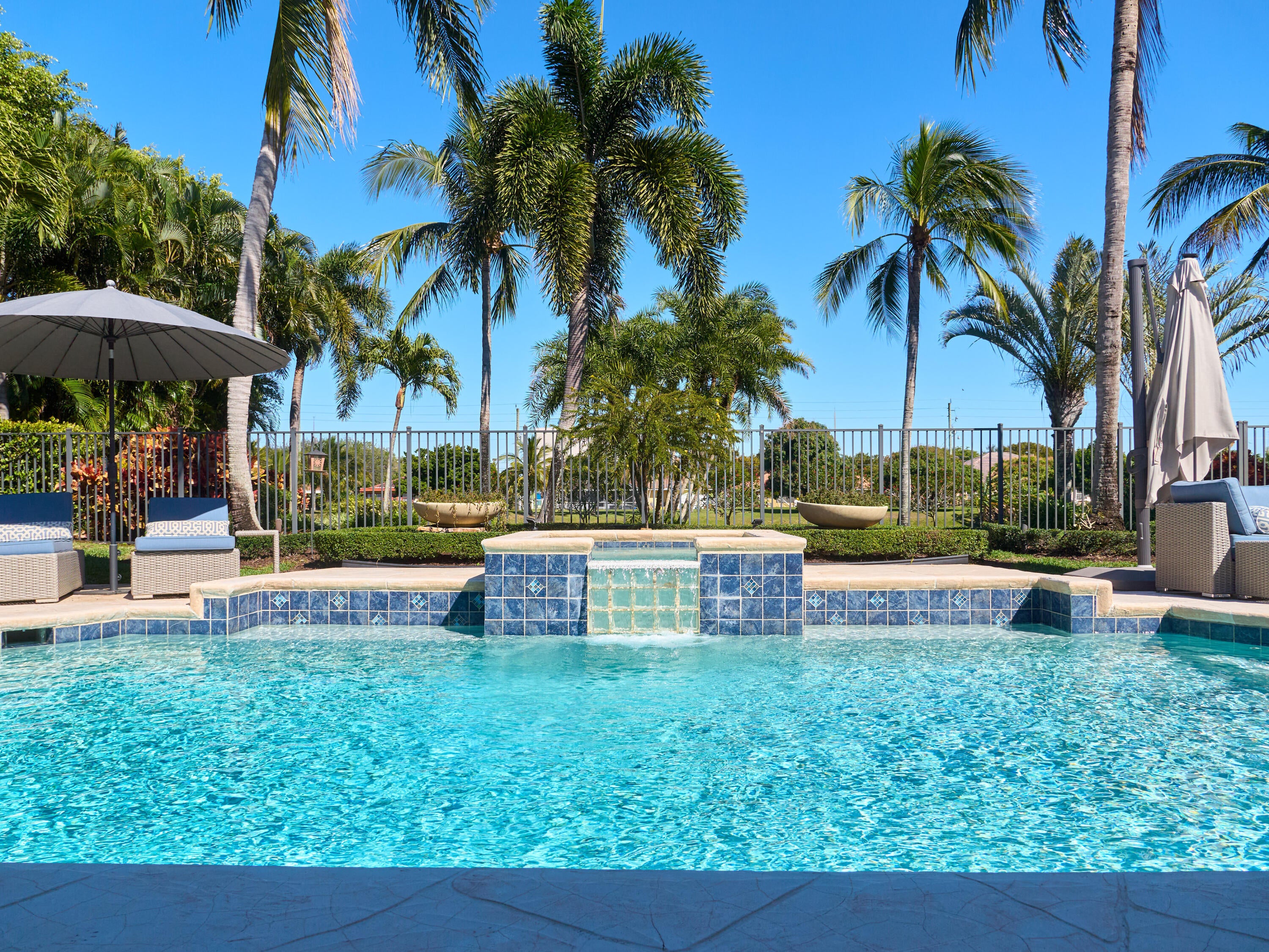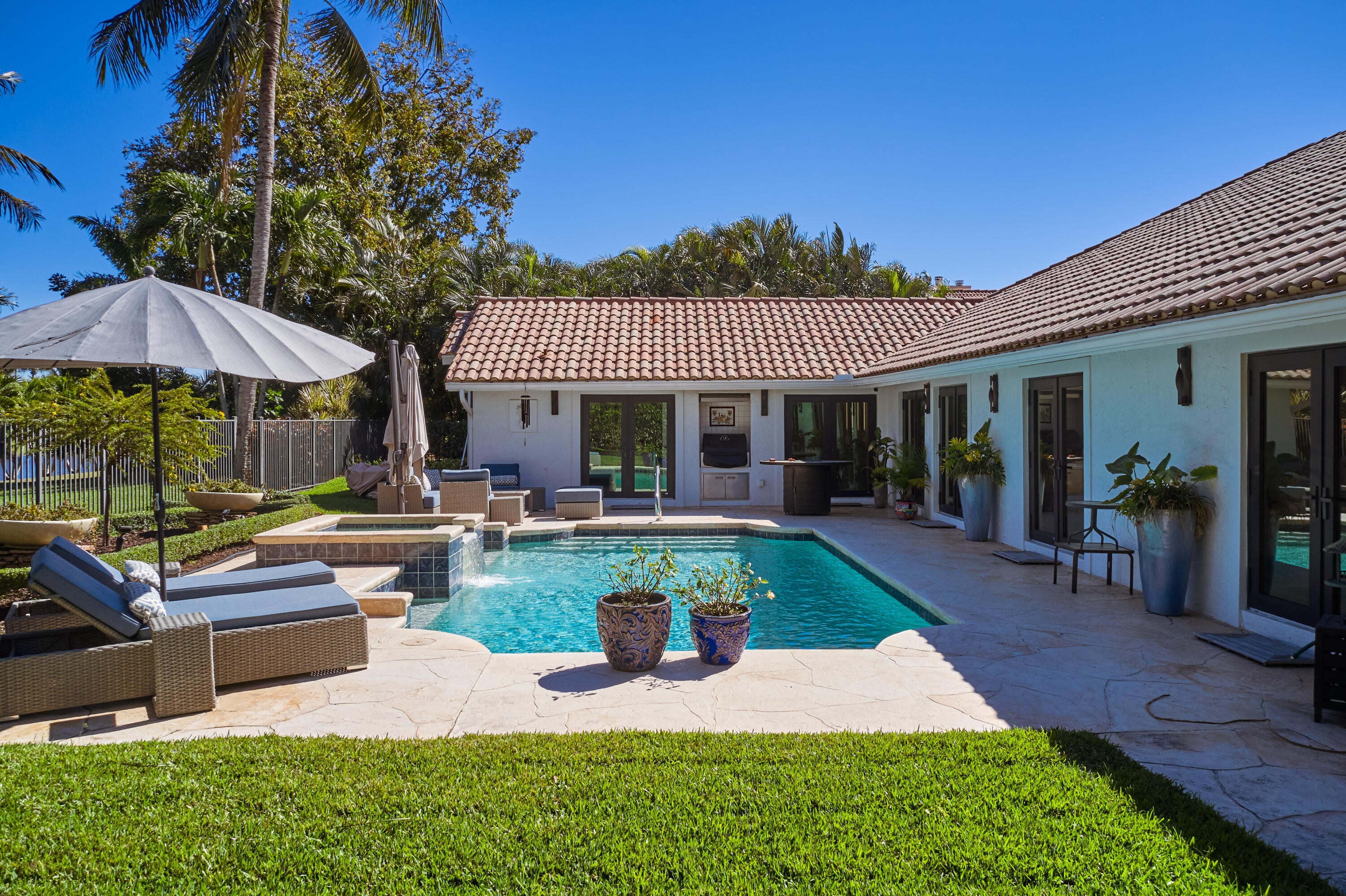 Welcome to this exquisite five-bedroom, four-bathroom residence in Presidential Estates, the only gated single-family community east of I-95. This highly sought-after waterfront enclave offers privacy, security, and exceptional convenience. The home features a bright, open-concept layout and includes two primary suites, one of which is a fully built new primary wing completed just two years ago, featuring a dedicated dressing room and custom shoe closet. The chef-inspired, recently redesigned kitchen showcases custom cabinetry, quartzite countertops, a new gas cook surface, and premium stainless-steel appliances. It is complemented by an adjacent, updated laundry room with quartzite countertops and a newer washer and dryer. A premium whole-home water purification system is paired with anadditional reverse-osmosis system, providing pure and instant hot water at the kitchen sink. Additionally the whole house is protected by the Moen Flo Smart Water Monitor and Shutoff which is an in-line device that provides 24/7 protection by automatically closing the main water supply if leaks, burst pipes, or high-pressure situations are detected. All bathrooms have been tastefully renovated with contemporary finishes. Recent upgrades include hurricane-impact doors and windows, new interior and exterior paint, conversion to natural gas, and a roof approximately eight years old. Significant system improvements include three recently installed A/C systems, including a dedicated new HVAC unit servicing the newly built primary suite. The private backyard offers a resort-style pool with raised spa and an updated summer kitchen. Pool enhancements include a natural gas heater (two years), a new AquaLink smart system, and a newer pool pump. Additional features include a two-car garage, driveway parking, and community tennis courts. The community is directly adjacent to Dutchman's Pipe Golf Club, accessible by foot or golf cart. Bear Lakes Country Club is just six minutes away and is known for having the lowest average handicap in Palm Beach County, making it the club of choice for many professional golfers. Ideally located near downtown West Palm Beach and Palm Beach Island, with close proximity to Whole Foods, Palm Beach Outlets, PBI Airport, beaches, and top-rated schools. Virtually new, this home has been extensively revised, including wiring, water systems, and windows, and includes a full home warranty effective at closing.