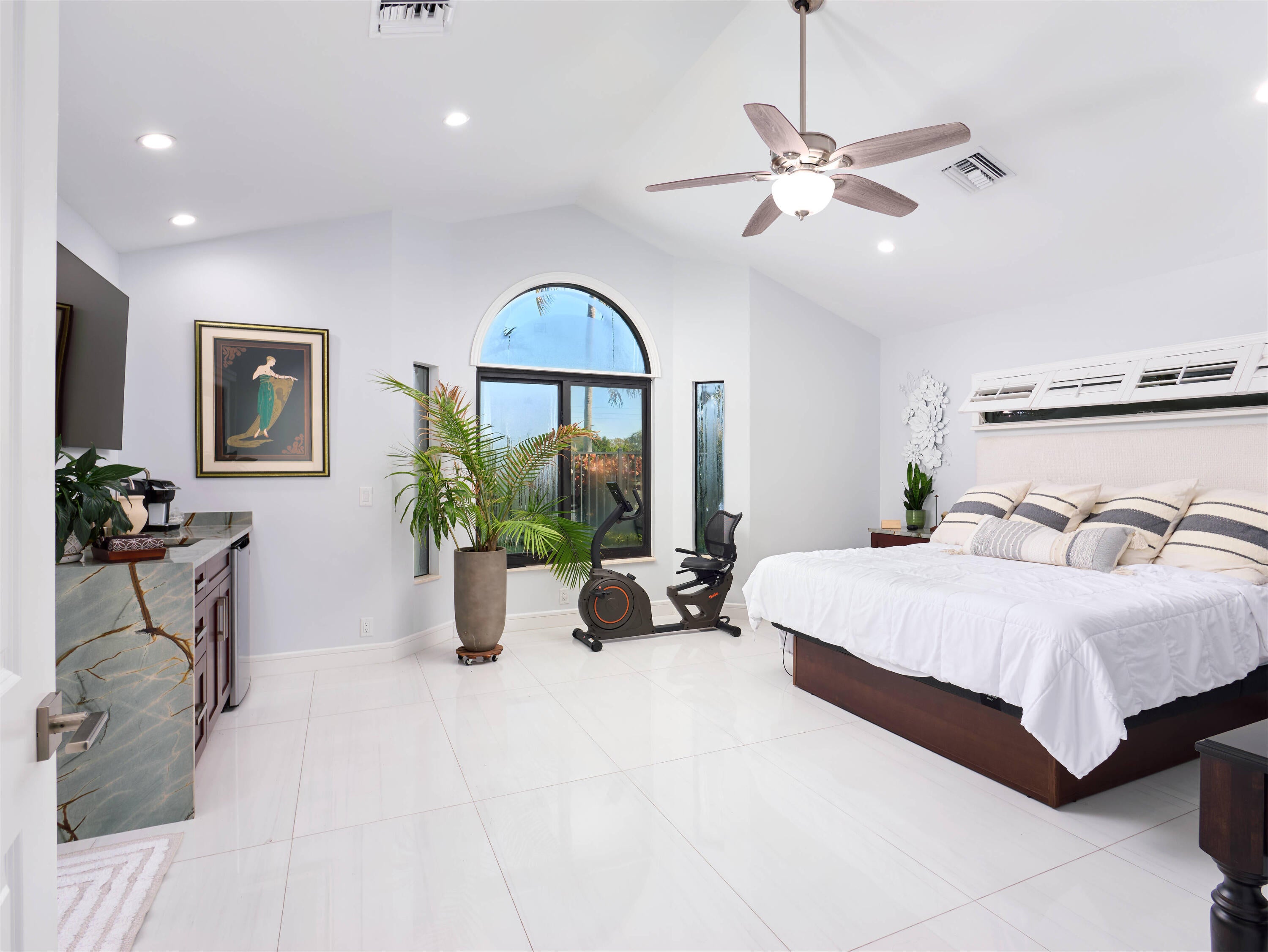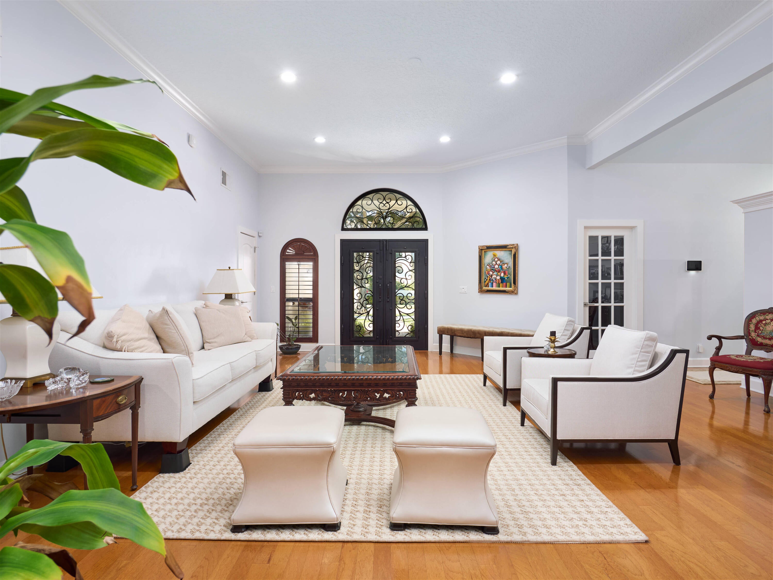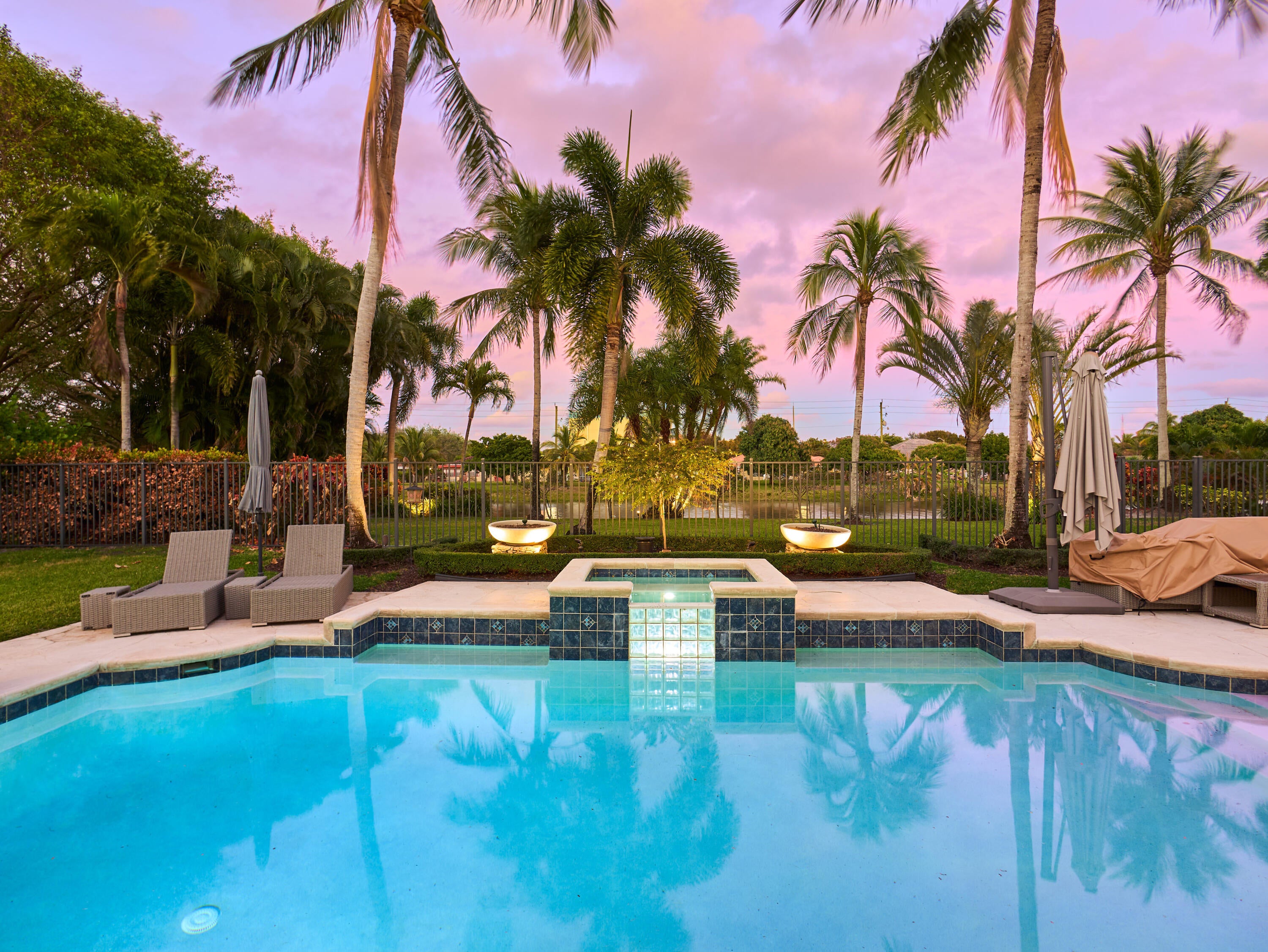 Welcome to this exquisite five-bedroom, four-bathroom residence in Presidential Estates, the only gated single-family community east of I-95. This highly sought-after waterfront enclave offers privacy, security, and exceptional convenience. The home features a bright, open-concept layout and includes two primary suites, one of which is a fully built new primary wing completed just two years ago, featuring a dedicated dressing room and custom shoe closet. The chef-inspired, recently redesigned kitchen showcases custom cabinetry, quartzite countertops, a new gas cook surface, and premium stainless-steel appliances. It is complemented by an adjacent, updated laundry room with quartzite countertops and a newer washer and dryer. A premium whole-home water purification system is paired with anadditional reverse-osmosis system, providing pure and instant hot water at the kitchen sink. Additionally the whole house is protected by the Moen Flo Smart Water Monitor and Shutoff which is an in-line device that provides 24/7 protection by automatically closing the main water supply if leaks, burst pipes, or high-pressure situations are detected. All bathrooms have been tastefully renovated with contemporary finishes. Recent upgrades include hurricane-impact doors and windows, new interior and exterior paint, conversion to natural gas, and a roof approximately eight years old. Significant system improvements include three recently installed A/C systems, including a dedicated new HVAC unit servicing the newly built primary suite. The private backyard offers a resort-style pool with raised spa and an updated summer kitchen. Pool enhancements include a natural gas heater (two years), a new AquaLink smart system, and a newer pool pump. Additional features include a two-car garage, driveway parking, and community tennis courts. The community is directly adjacent to Dutchman's Pipe Golf Club, accessible by foot or golf cart. Bear Lakes Country Club is just six minutes away and is known for having the lowest average handicap in Palm Beach County, making it the club of choice for many professional golfers. Ideally located near downtown West Palm Beach and Palm Beach Island, with close proximity to Whole Foods, Palm Beach Outlets, PBI Airport, beaches, and top-rated schools. Virtually new, this home has been extensively revised, including wiring, water systems, and windows, and includes a full home warranty effective at closing.