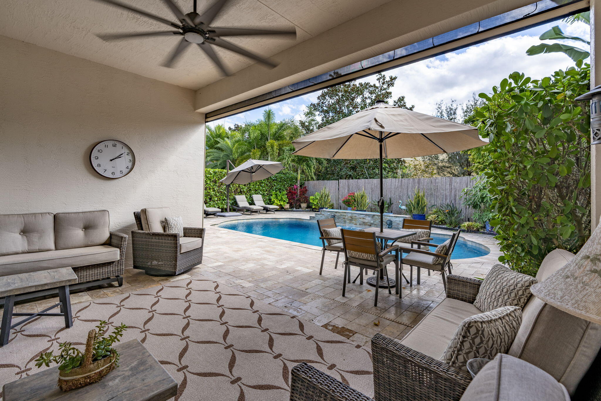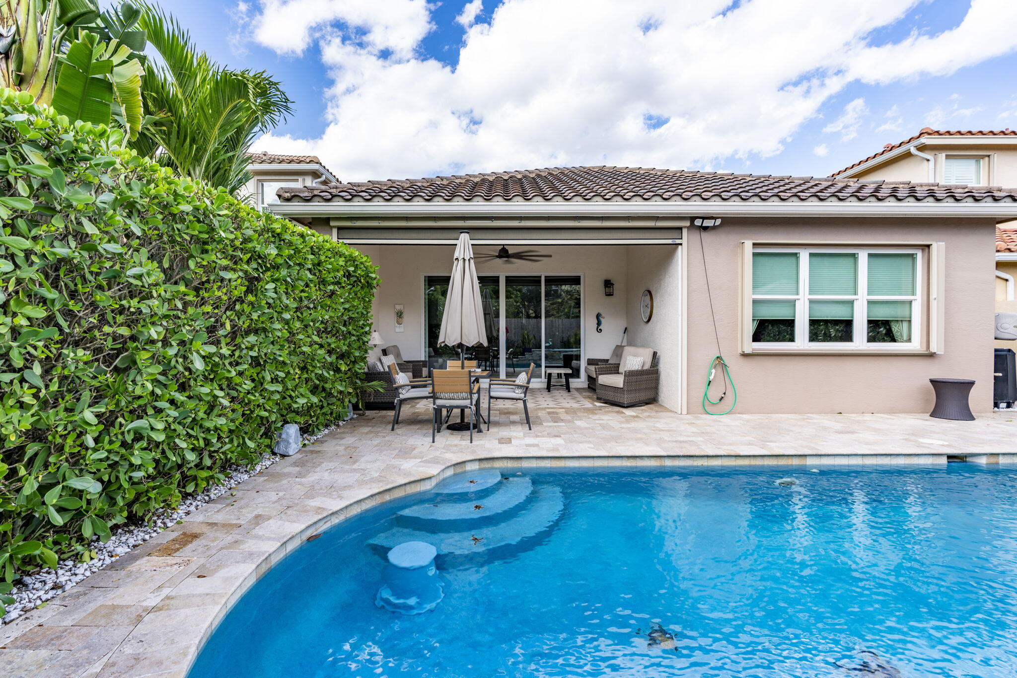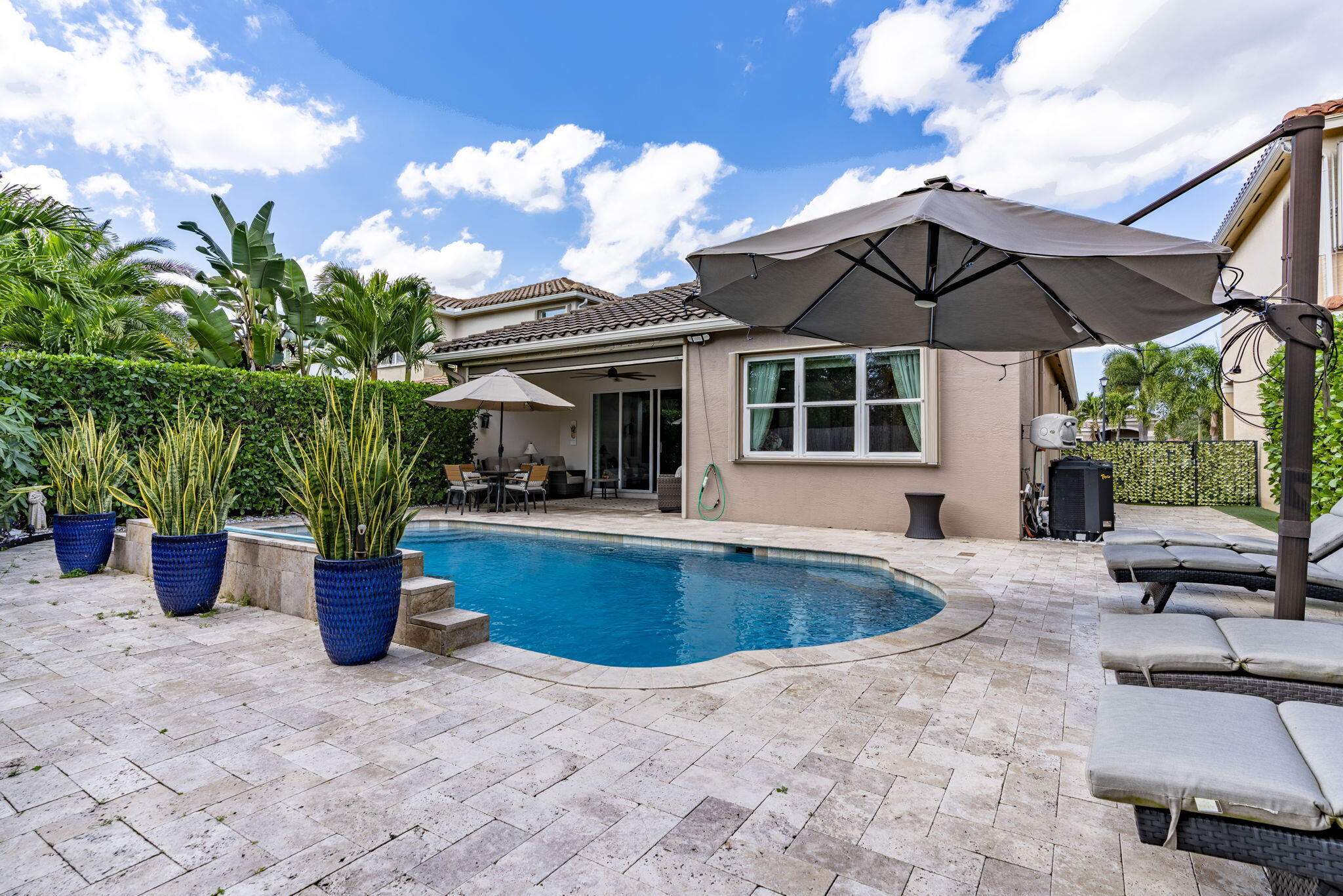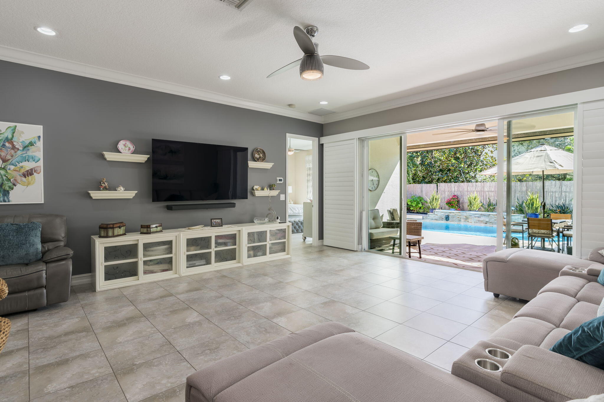 This one-story pool home in Boynton Beach is simply beautiful. This Updated 2 bedroom, 2 Full-bathrooms with bonus room that could easily be turned into a third-bedroom rancher, has an open floor plan that really flows. The kitchen is the heart of the home with the extra large island that opens up to the heated saltwater pool. The oversized primary bedroom has custom closets with updated tile flooring. The walk-in shower is updated. The second bedroom is a generous size with custom closets as well. All appliances are less than 5 years old. In Kitchen you will find GE PROFILE. Custom paint interior and exterior recently done. Whole house water filtration system and beautiful crown molding throughout home. Custom wall to wall built-in, found in the bonus room. Windows in home are adorned with Plantation Shutters to add that extra touch and privacy. Travertine tile in backyard and pool with Astro turf for your pets. Don't miss your chance to own, one of the only, single-story ranchers on the market... in this price range! Call today for a private tour to see all this home offers in the meantime check out the 3-D custom virtual Matterport tour to see every inch of home in detail, link is attached to listing!!