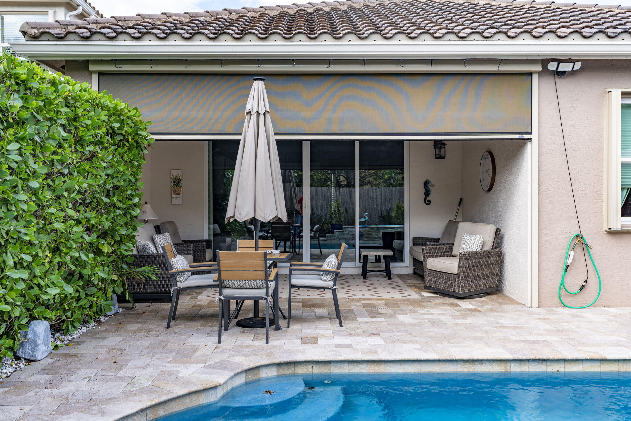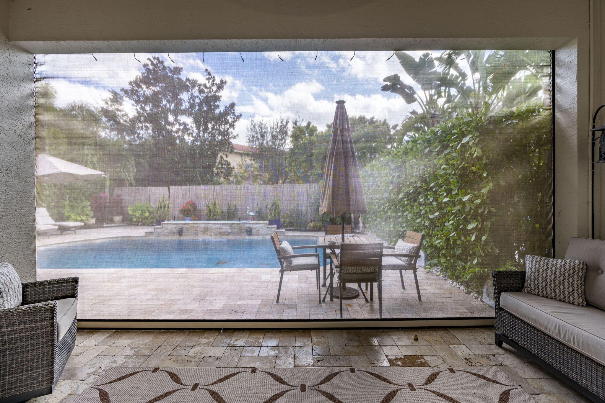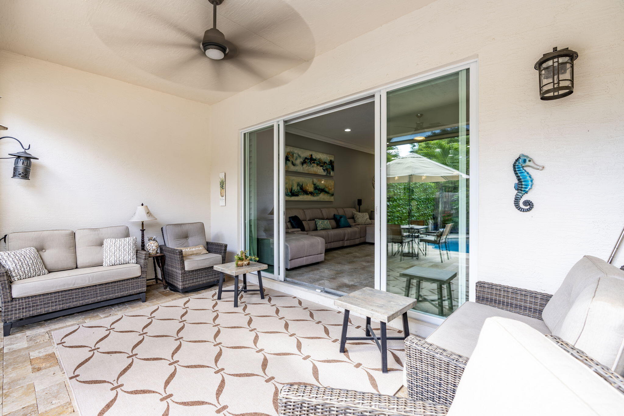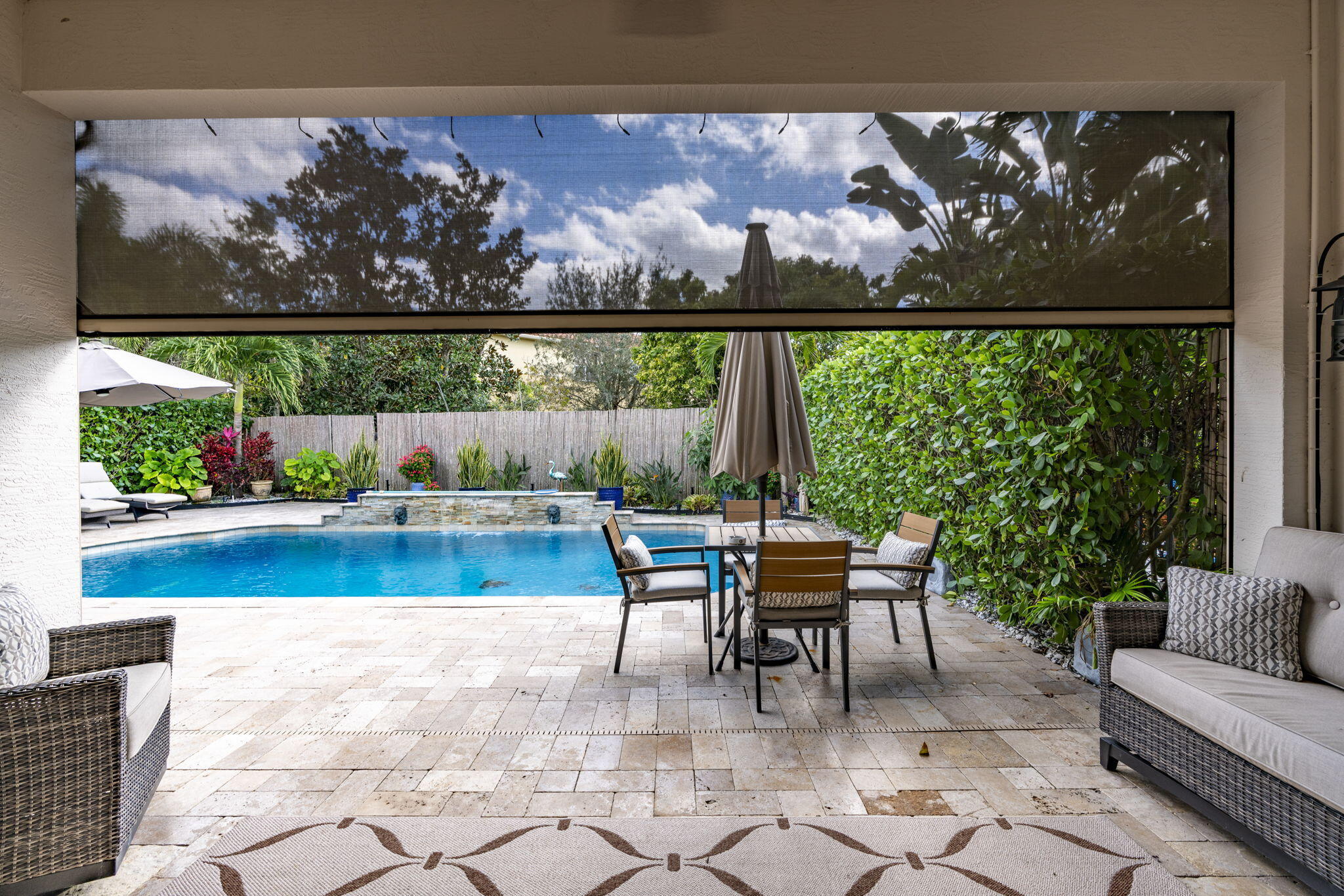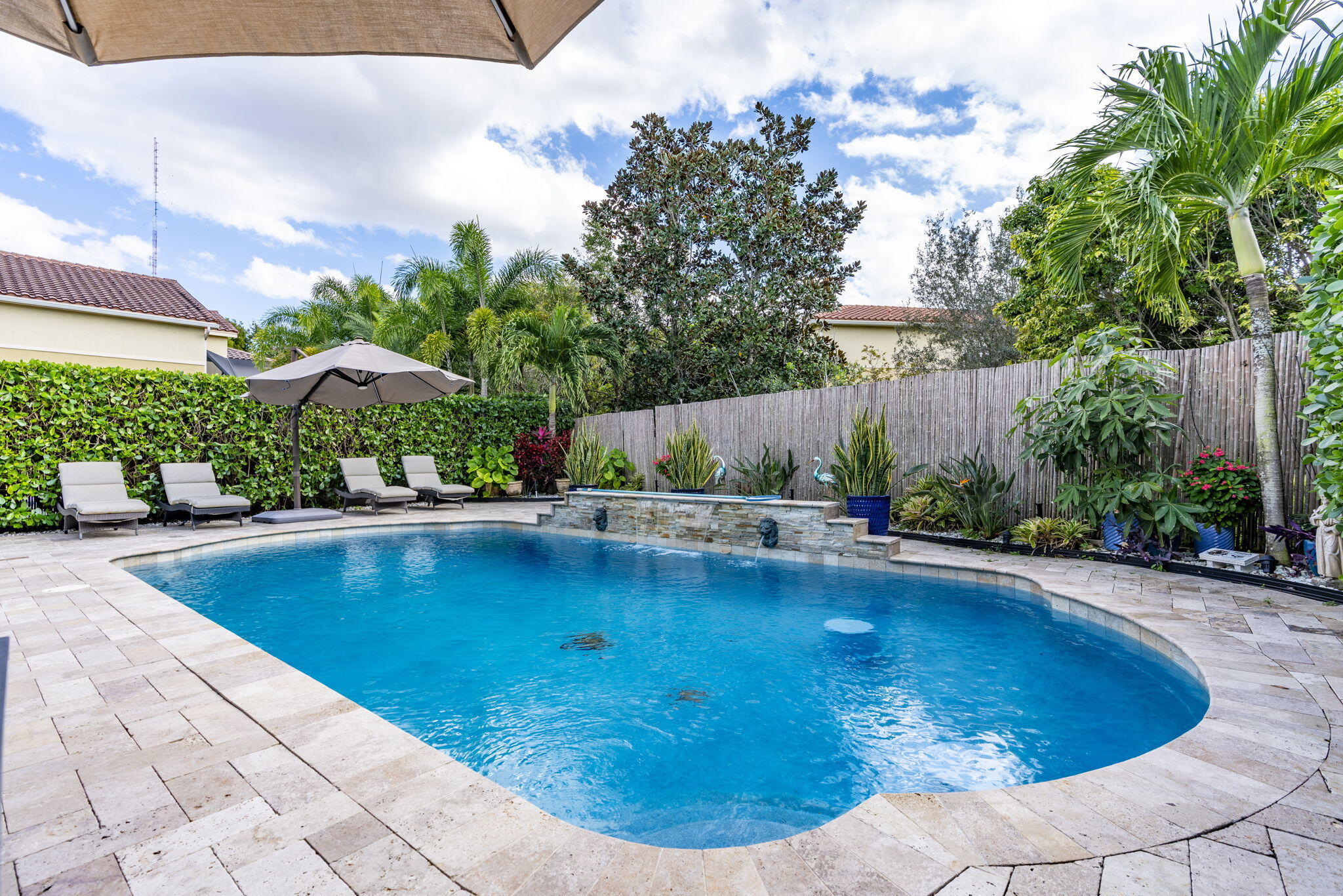 This one-story pool home in Boynton Beach is simply beautiful. This Updated 2 bedroom, 2 Full-bathrooms with bonus room that could easily be turned into a third-bedroom rancher, has an open floor plan that really flows. The kitchen is the heart of the home with the extra large island that opens up to the heated saltwater pool. The oversized primary bedroom has custom closets with updated tile flooring. The walk-in shower is updated. The second bedroom is a generous size with custom closets as well. All appliances are less than 5 years old. In Kitchen you will find GE PROFILE. Custom paint interior and exterior recently done. Whole house water filtration system and beautiful crown molding throughout home. Custom wall to wall built-in, found in the bonus room. Windows in home are adorned with Plantation Shutters to add that extra touch and privacy. Travertine tile in backyard and pool with Astro turf for your pets. Don't miss your chance to own, one of the only, single-story ranchers on the market... in this price range! Call today for a private tour to see all this home offers in the meantime check out the 3-D custom virtual Matterport tour to see every inch of home in detail, link is attached to listing!!